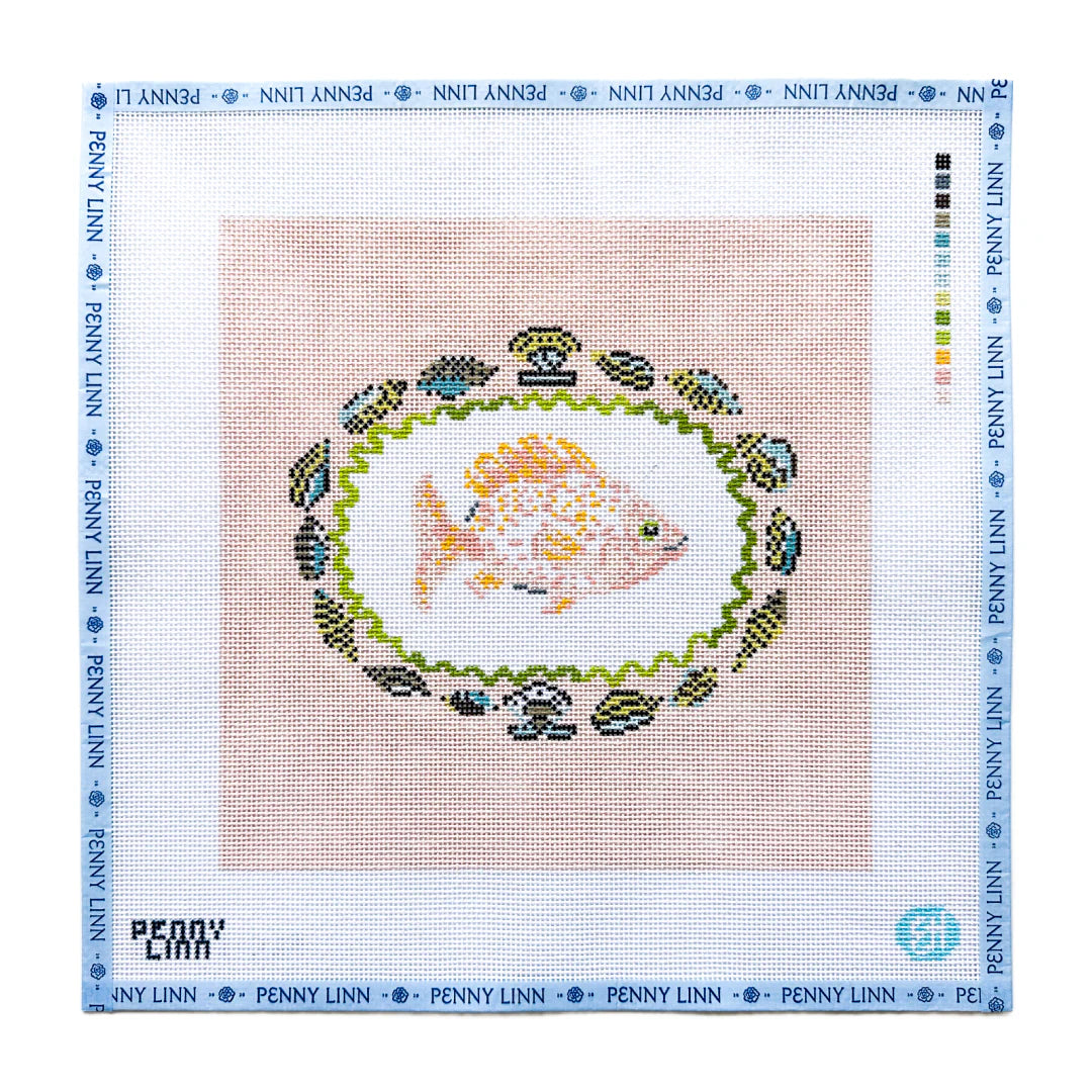 This is a hand painted needlepoint canvas by Evelyn Henson from Penny Linn. This canvas features a painting of a pink fish set in the center of an elegant platter insert design.