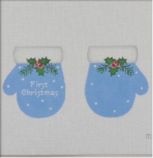 This needlepoint canvas by Pepperberry Designs features a two sided mitten with "First Christmas" against a blue background. It is stitch printed with hand painted detail.
