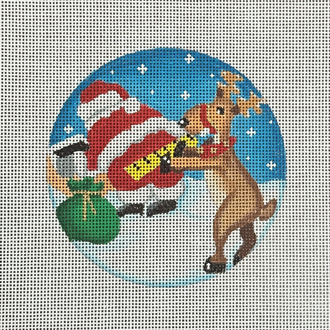 This hand painted needlepoint canvas by Pepperberry Designs features a cheeky reindeer taking a measurement of Santa's bottom.