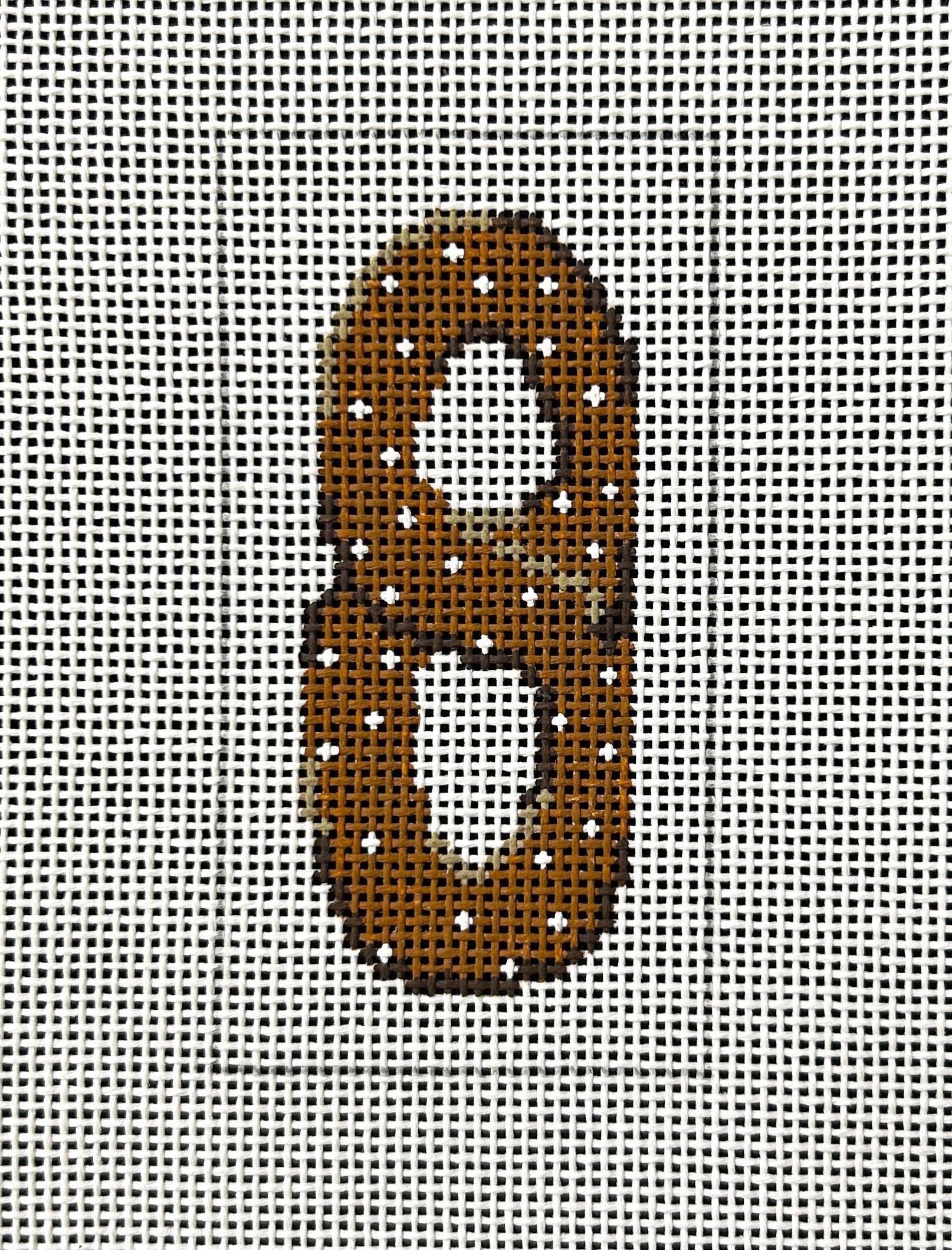 This hand painted needlepoint canvas by Rittenhouse Needlepoint features the distinctive Philly pretzel. Philly's unique pretzel is wider, doughier, and softer than the standard soft pretzel, and has a unique elongated shape. It is baked in rows of several pretzels baked together that pull apart when finished. It is believed to have been developed in the 1920s when the already popular standard soft pretzel was updated for bulk baking. Pretzels remain as important to Philadelphians as bagels are to New Yorkers. Philadelphians are said to eat twelve times the national average of pretzels annually!
