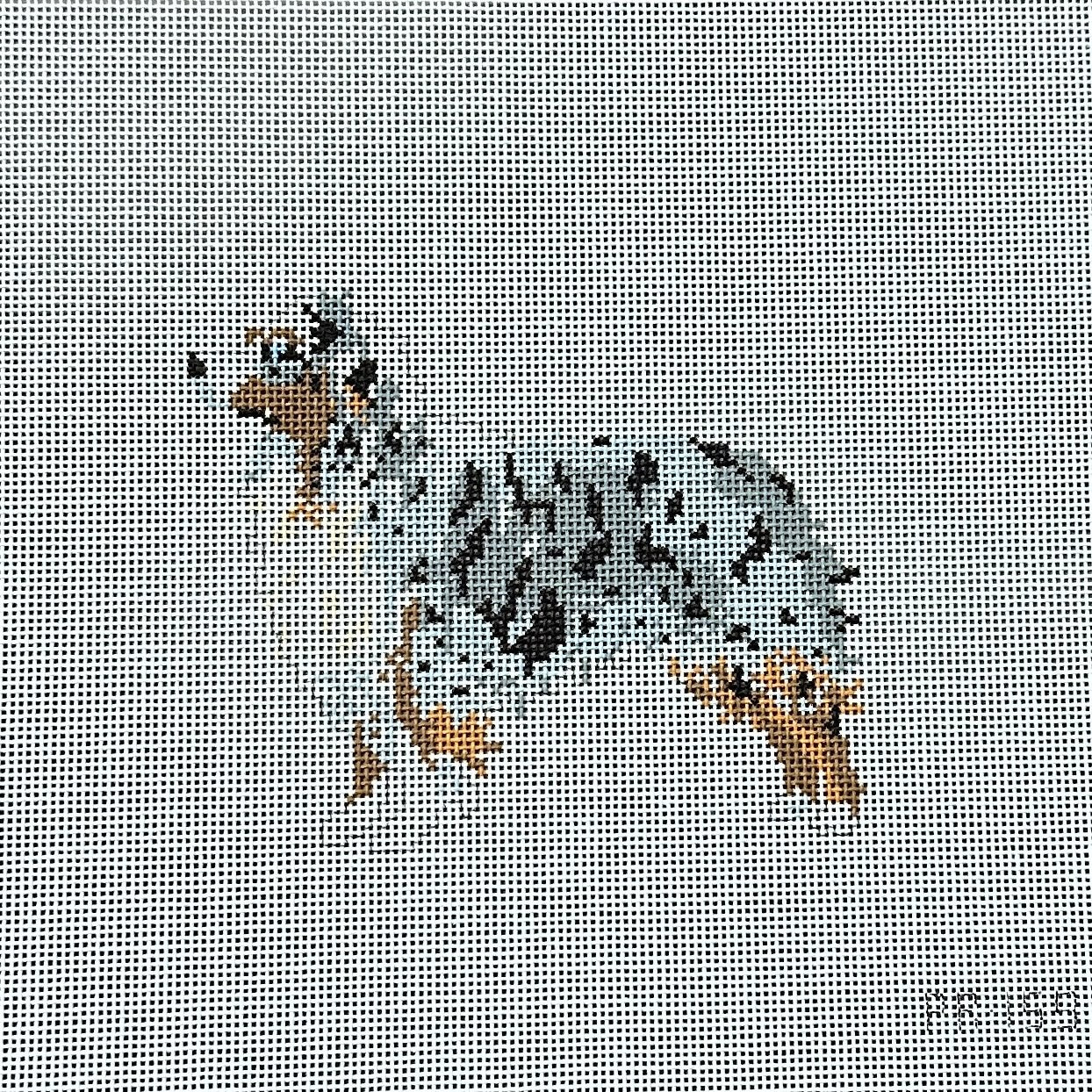 This hand painted needlepoint canvas by Pip & Roo features a handsome Australian shepherd dog. Stitched examples shown for inspiration, materials sold separately.