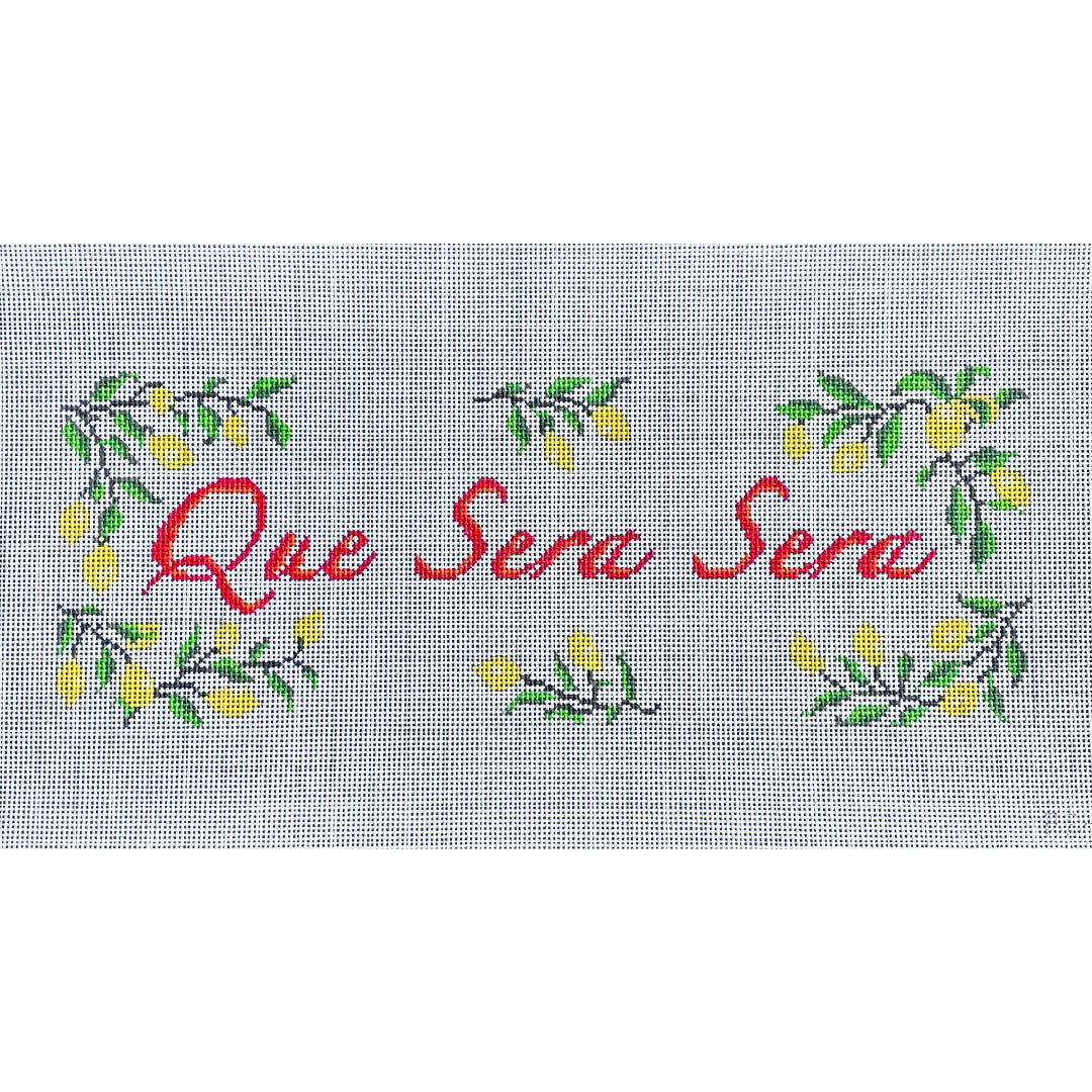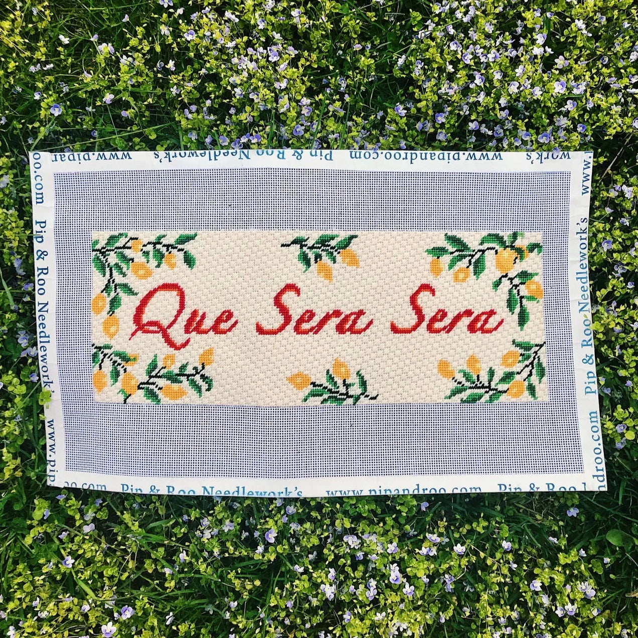 This hand painted needlepoint canvas by Pip & Roo features a the phrase "Que Sera Sera" with lemons. Finished examples are shown for inspiration, materials and finishing services sold separately.