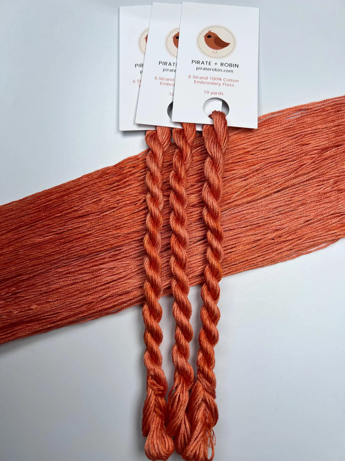 This is 6 Strand Embroidery Floss from Pirate + Robin in color Apricot. Hand-dyed in small batches in Oregon, Pirate + Robin cotton floss features beautiful tonal shades with subtle variations as well as more strongly variegated colorways! Their recipe is inspired by a tie-dye recipe the creator learned as a teenager, resulting in bold and vibrant colors. Skeins have been washed multiple times after dyeing to make them as colorfast as possible. Excellent for embroidery, cross stitch, and needlepoint. Use 3-4 strands on 18 mesh canvas and all 6 strands on 13 mesh.
