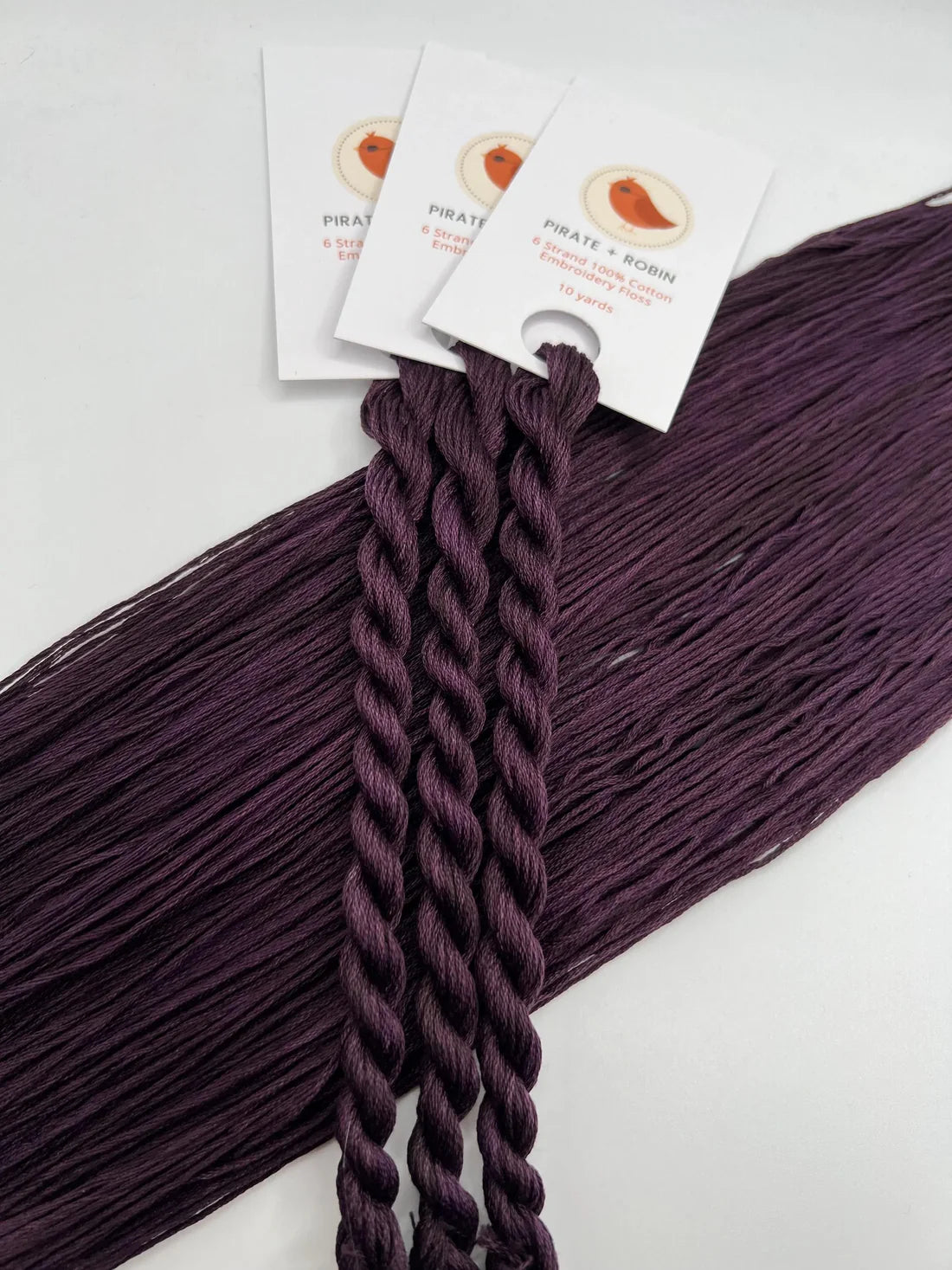 This is 6 Strand Embroidery Floss from Pirate + Robin in color Aubergine. Hand-dyed in small batches in Oregon, Pirate + Robin cotton floss features beautiful tonal shades with subtle variations as well as more strongly variegated colorways! Their recipe is inspired by a tie-dye recipe the creator learned as a teenager, resulting in bold and vibrant colors. Skeins have been washed multiple times after dyeing to make them as colorfast as possible. Excellent for embroidery, cross stitch, and needlepoint. Use 3-4 strands on 18 mesh canvas and all 6 strands on 13 mesh.