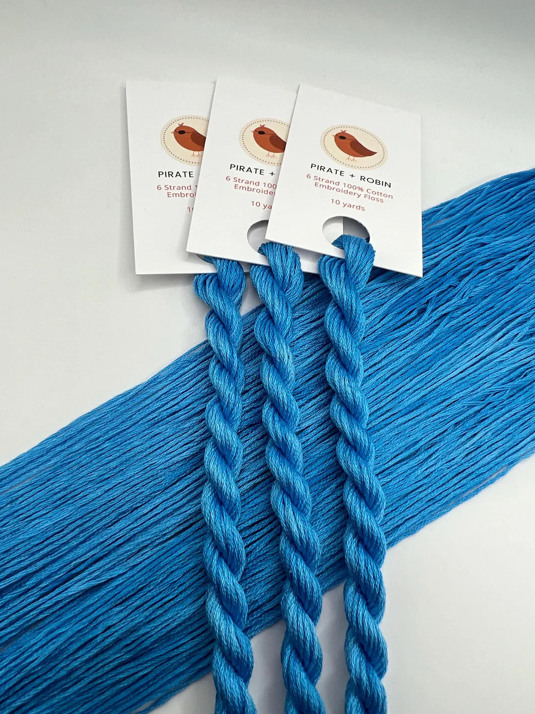 This is 6 Strand Embroidery Floss from Pirate + Robin in color Baby Blue. Hand-dyed in small batches in Oregon, Pirate + Robin cotton floss features beautiful tonal shades with subtle variations as well as more strongly variegated colorways! Their recipe is inspired by a tie-dye recipe the creator learned as a teenager, resulting in bold and vibrant colors. Skeins have been washed multiple times after dyeing to make them as colorfast as possible. Excellent for embroidery, cross stitch, and needlepoint. Use 3-4 strands on 18 mesh canvas and all 6 strands on 13 mesh.