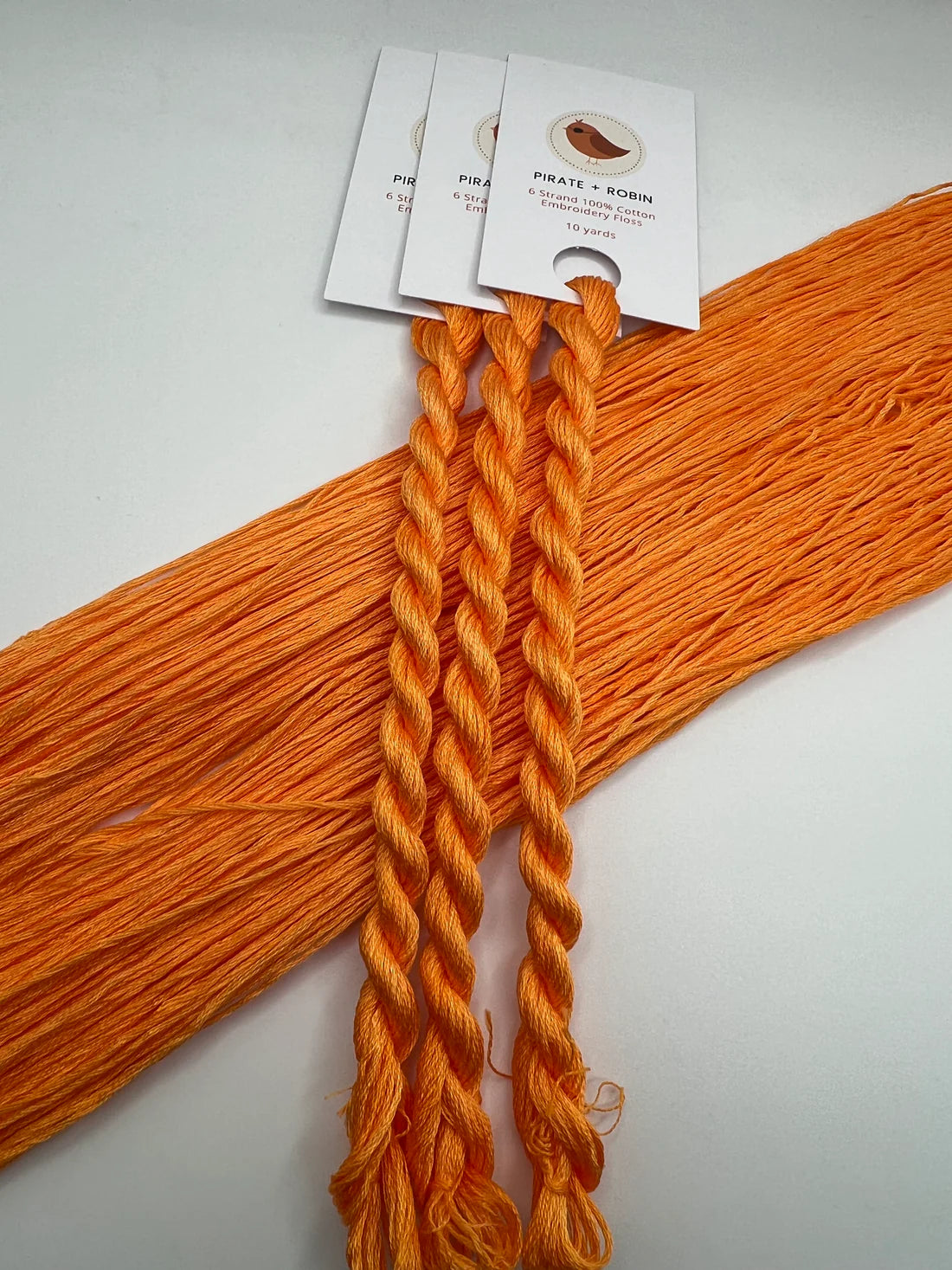 This is 6 Strand Embroidery Floss from Pirate + Robin in color Cantaloupe. Hand-dyed in small batches in Oregon, Pirate + Robin cotton floss features beautiful tonal shades with subtle variations as well as more strongly variegated colorways! Their recipe is inspired by a tie-dye recipe the creator learned as a teenager, resulting in bold and vibrant colors. Skeins have been washed multiple times after dyeing to make them as colorfast as possible. Excellent for embroidery, cross stitch, and needlepoint. Use 3-4 strands on 18 mesh canvas and all 6 strands on 13 mesh.