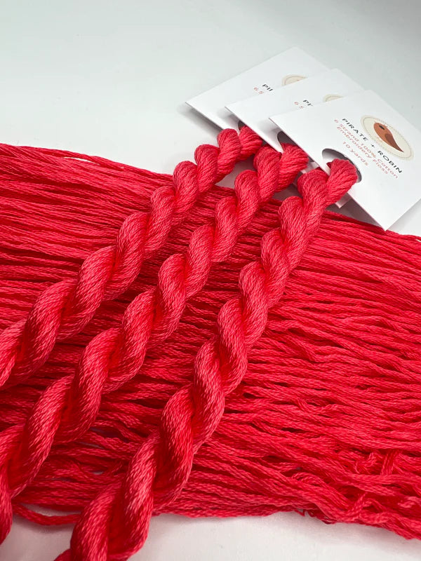 This is 6 Strand Embroidery Floss from Pirate + Robin in color Miami. Hand-dyed in small batches in Oregon, Pirate + Robin cotton floss features beautiful tonal shades with subtle variations as well as more strongly variegated colorways! Their recipe is inspired by a tie-dye recipe the creator learned as a teenager, resulting in bold and vibrant colors. Skeins have been washed multiple times after dyeing to make them as colorfast as possible. Excellent for embroidery, cross stitch, and needlepoint. Use 3-4 strands on 18 mesh canvas and all 6 strands on 13 mesh.