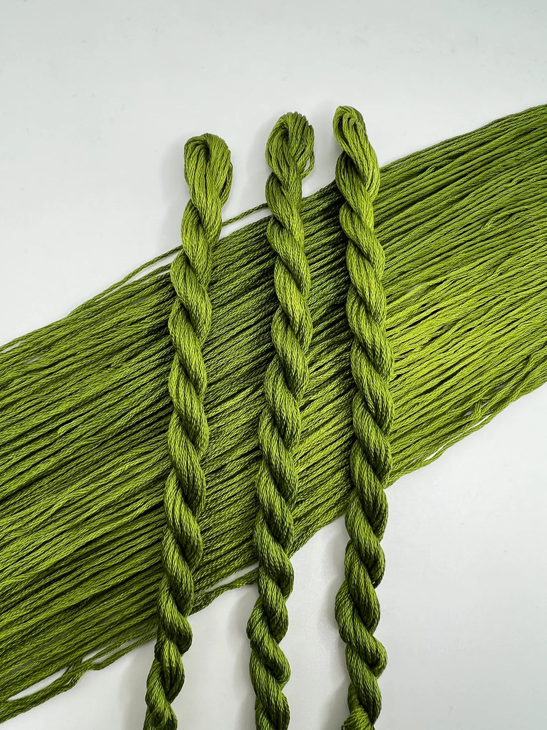 This is 6 Strand Embroidery Floss from Pirate + Robin in color Pickle. Hand-dyed in small batches in Oregon, Pirate + Robin cotton floss features beautiful tonal shades with subtle variations as well as more strongly variegated colorways! Their recipe is inspired by a tie-dye recipe the creator learned as a teenager, resulting in bold and vibrant colors. Skeins have been washed multiple times after dyeing to make them as colorfast as possible. Excellent for embroidery, cross stitch, and needlepoint. Use 3-4 strands on 18 mesh canvas and all 6 strands on 13 mesh.