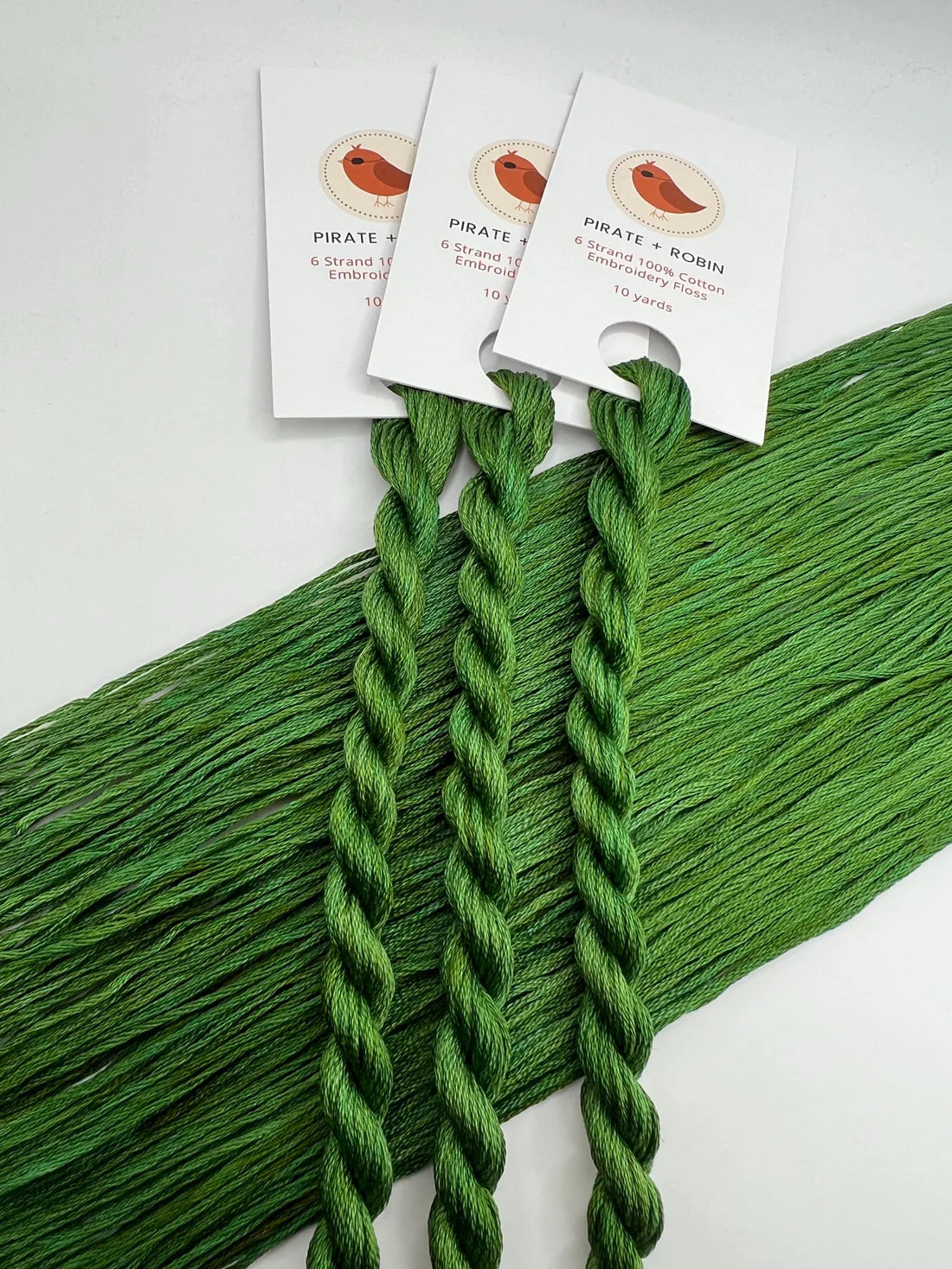 This is 6 Strand Embroidery Floss from Pirate + Robin in color Pine. Hand-dyed in small batches in Oregon, Pirate + Robin cotton floss features beautiful tonal shades with subtle variations as well as more strongly variegated colorways! Their recipe is inspired by a tie-dye recipe the creator learned as a teenager, resulting in bold and vibrant colors. Skeins have been washed multiple times after dyeing to make them as colorfast as possible. Excellent for embroidery, cross stitch, and needlepoint. Use 3-4 strands on 18 mesh canvas and all 6 strands on 13 mesh.