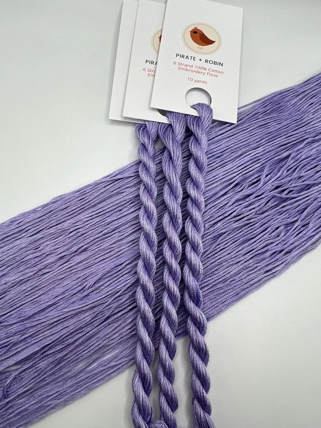 This is 6 Strand Embroidery Floss from Pirate + Robin in color Wisteria. Hand-dyed in small batches in Oregon, Pirate + Robin cotton floss features beautiful tonal shades with subtle variations as well as more strongly variegated colorways! Their recipe is inspired by a tie-dye recipe the creator learned as a teenager, resulting in bold and vibrant colors. Skeins have been washed multiple times after dyeing to make them as colorfast as possible. Excellent for embroidery, cross stitch, and needlepoint. Use 3-4 strands on 18 mesh canvas and all 6 strands on 13 mesh.