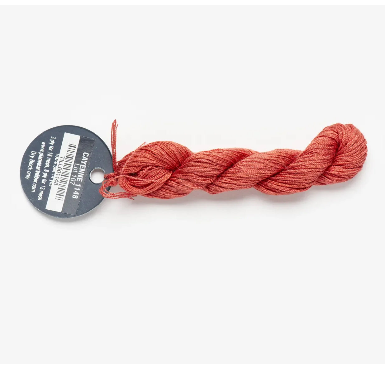 This is Ply Silk from Planet Earth in color 1148 Cayenne. Rich strandable silks in a wide range of colors, excellent for embroidery, needlepoint, and cross stitch. Use as-is on 13 mesh, 3 or 4 strands on 18 mesh. Colors match Planet Earth Silk.