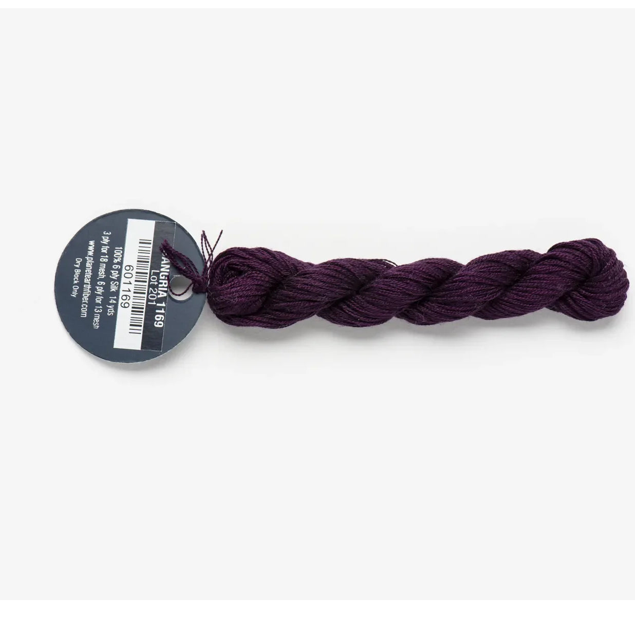 This is Ply Silk from Planet Earth in color 1169 Sangria. Rich strandable silks in a wide range of colors, excellent for embroidery, needlepoint, and cross stitch. Use as-is on 13 mesh, 3 or 4 strands on 18 mesh. Colors match Planet Earth Silk.