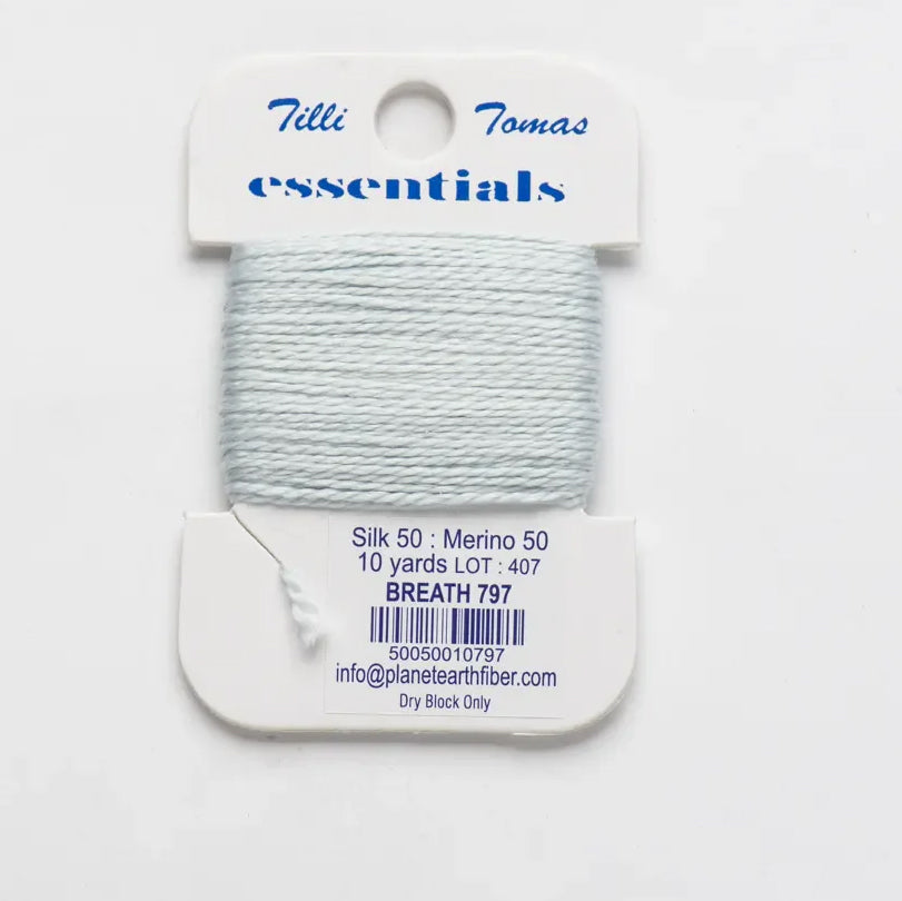 These are Tilli Tomas Essentials from Planet Earth in color 797 Breath. A silk-wool blend perfect for 18 mesh canvases. 1 ply on 18 mesh. Colors match Milan.