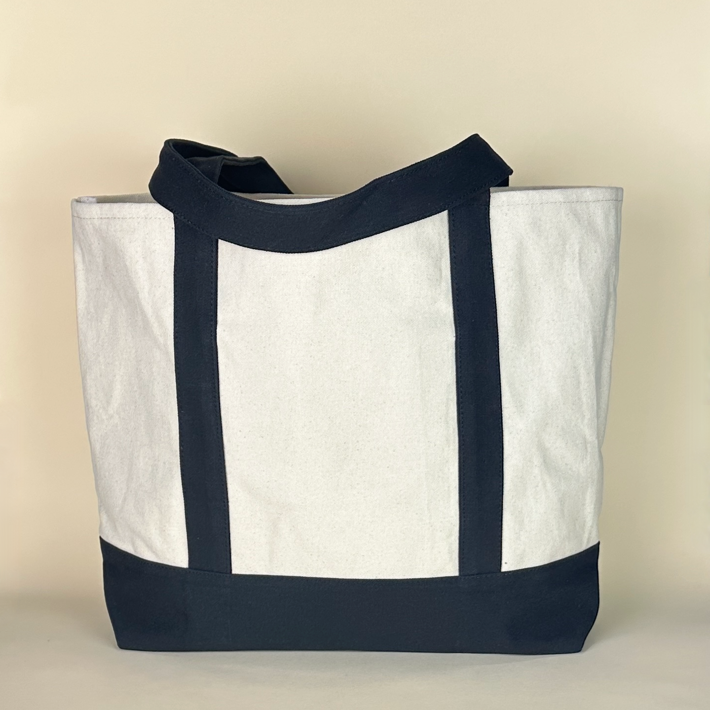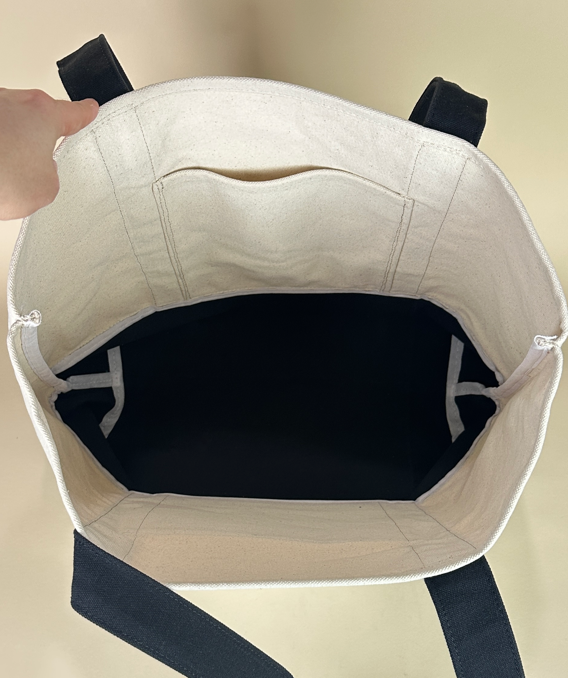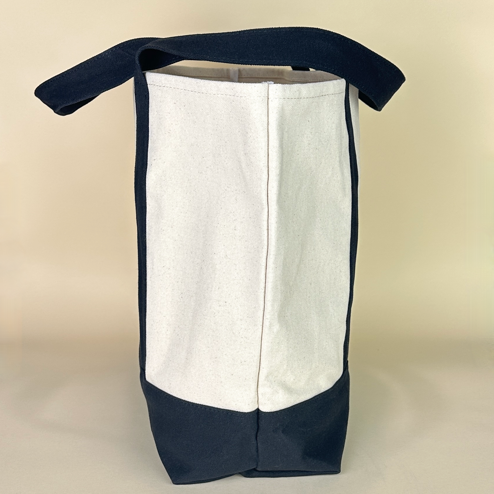 This is a self finishing tote bag from Planet Earth / Tilli Tomas. It is made of a sturdy cotton canvas with a natural canvas body and black accents. It is a generous size with one slip pocket in the unlined interior. On the front, it has a 6 inch square opening for a needlepoint canvas. Instructions for how to attach your canvas are included.
