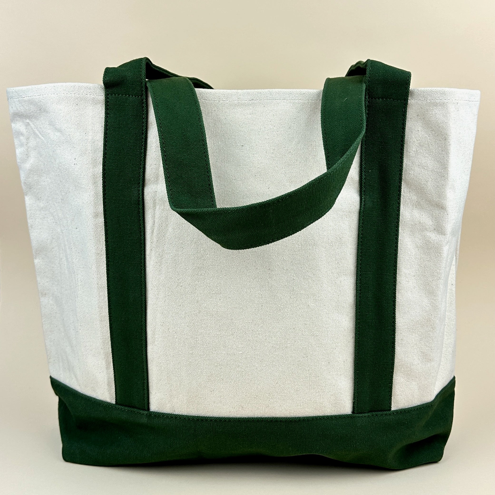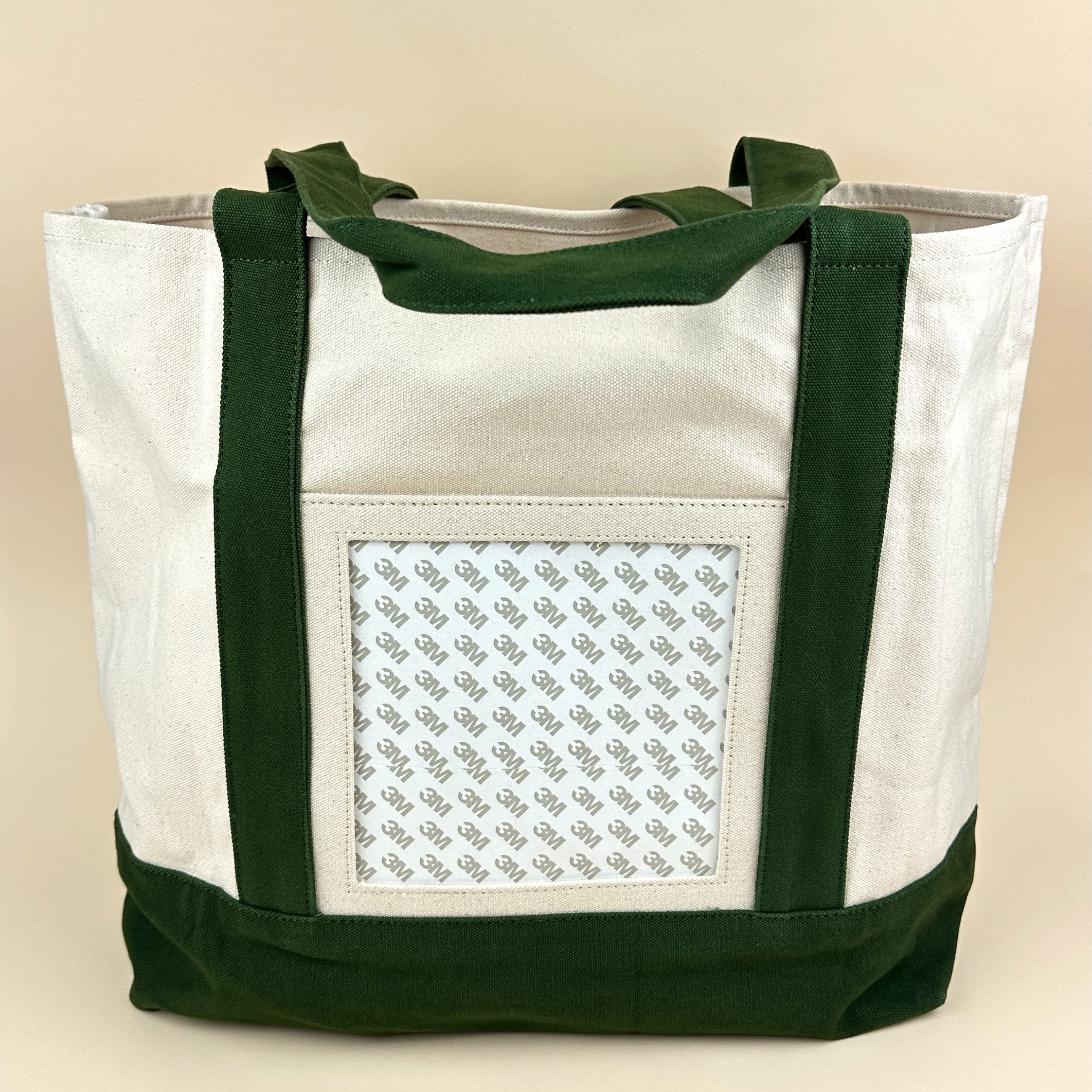 This is a self finishing tote bag from Planet Earth / Tilli Tomas. It is made of a sturdy cotton canvas with a natural canvas body and Forest Green accents. It is a generous size with one slip pocket in the unlined interior. On the front, it has a 6 inch square opening for a needlepoint canvas. Instructions for how to attach your canvas are included.