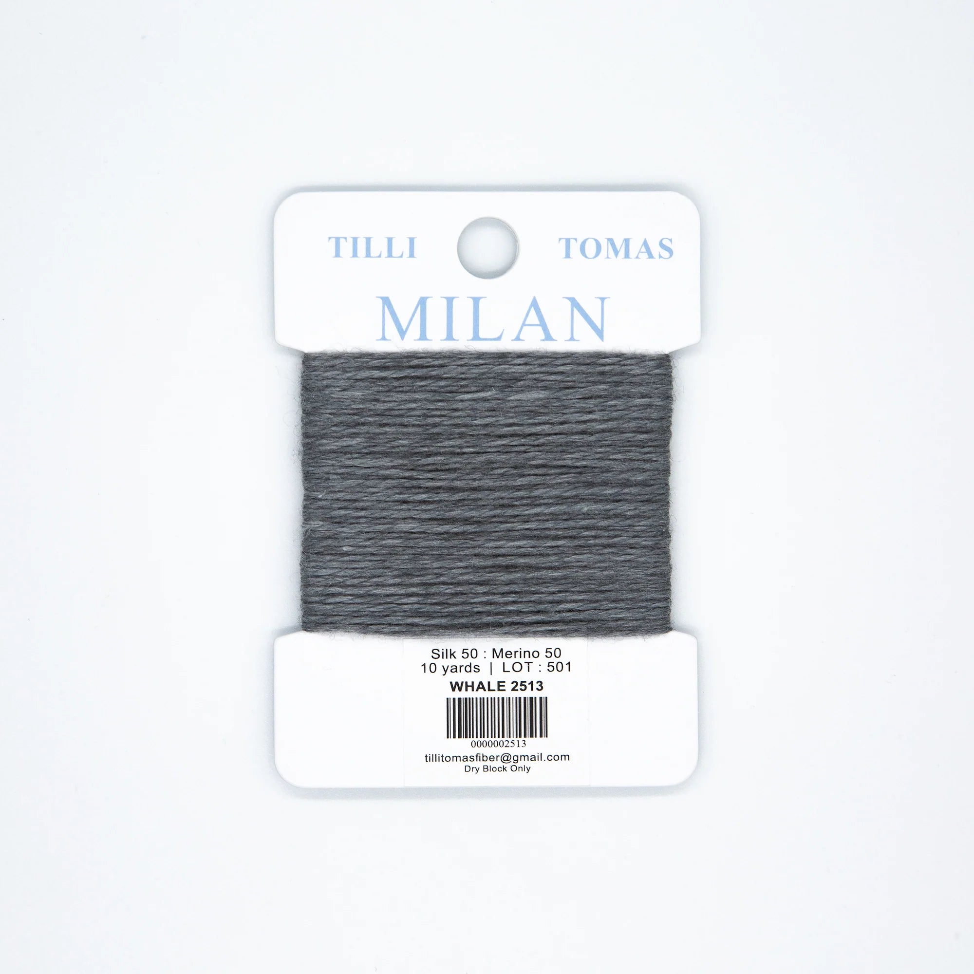 This is a Milan color card from Planet Earth in Whale. A soft silk-wool blend that is perfect for pillows. 1 ply on 13 mesh. Colors match Essentials.
