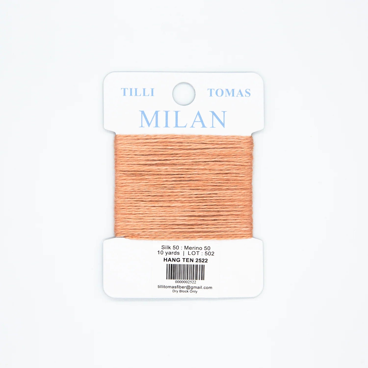 This is a Milan color card from Planet Earth in Hang Ten. A soft silk-wool blend that is perfect for pillows. 1 ply on 13 mesh. Colors match Essentials.