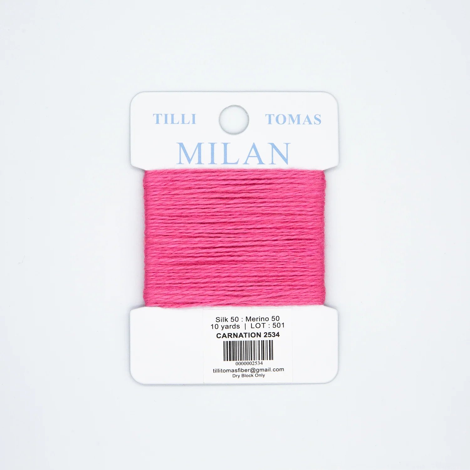 This is a Milan color card from Planet Earth in Carnation. A soft silk-wool blend that is perfect for pillows. 1 ply on 13 mesh. Colors match Essentials.