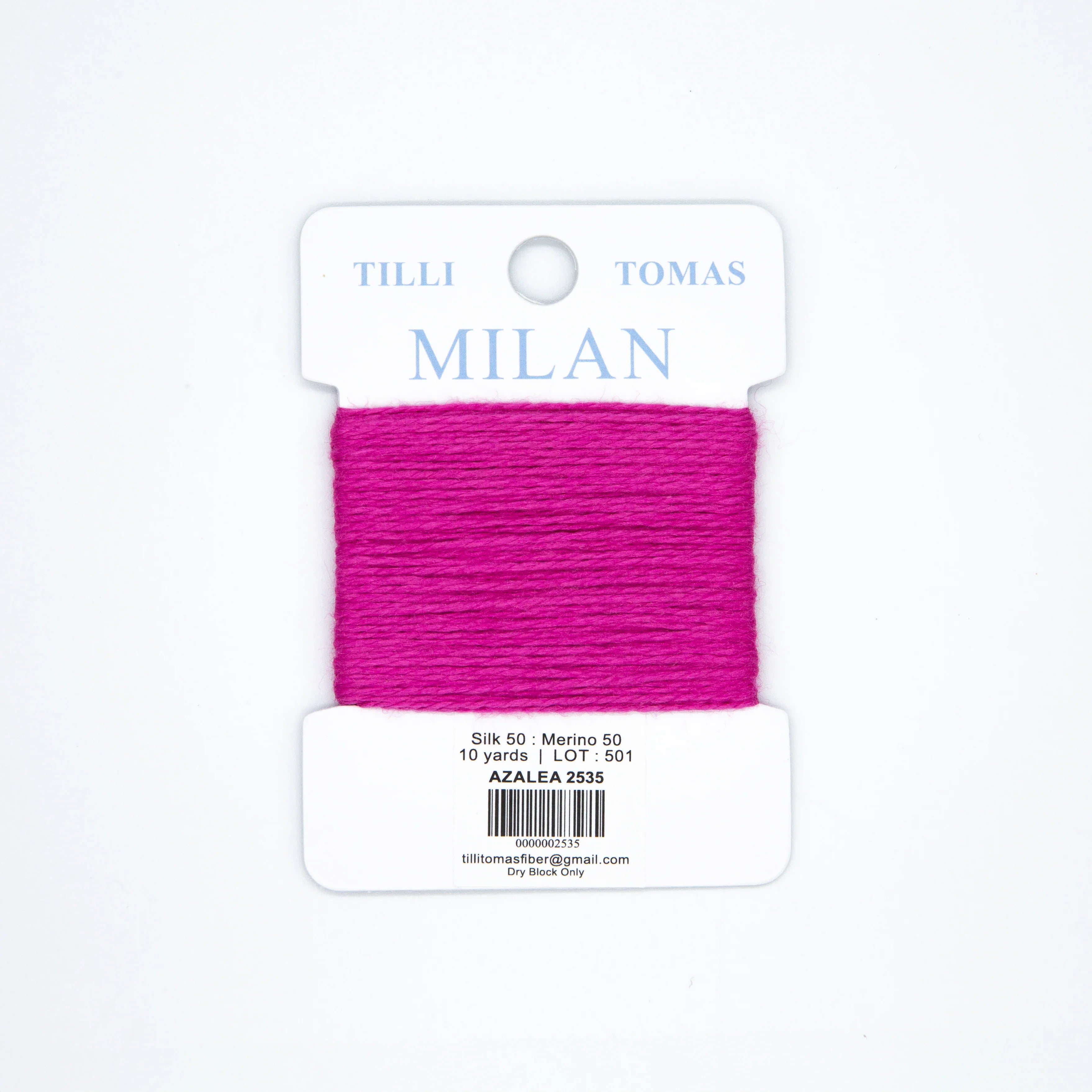 This is a Milan color card from Planet Earth in Azalea. A soft silk-wool blend that is perfect for pillows. 1 ply on 13 mesh. Colors match Essentials.