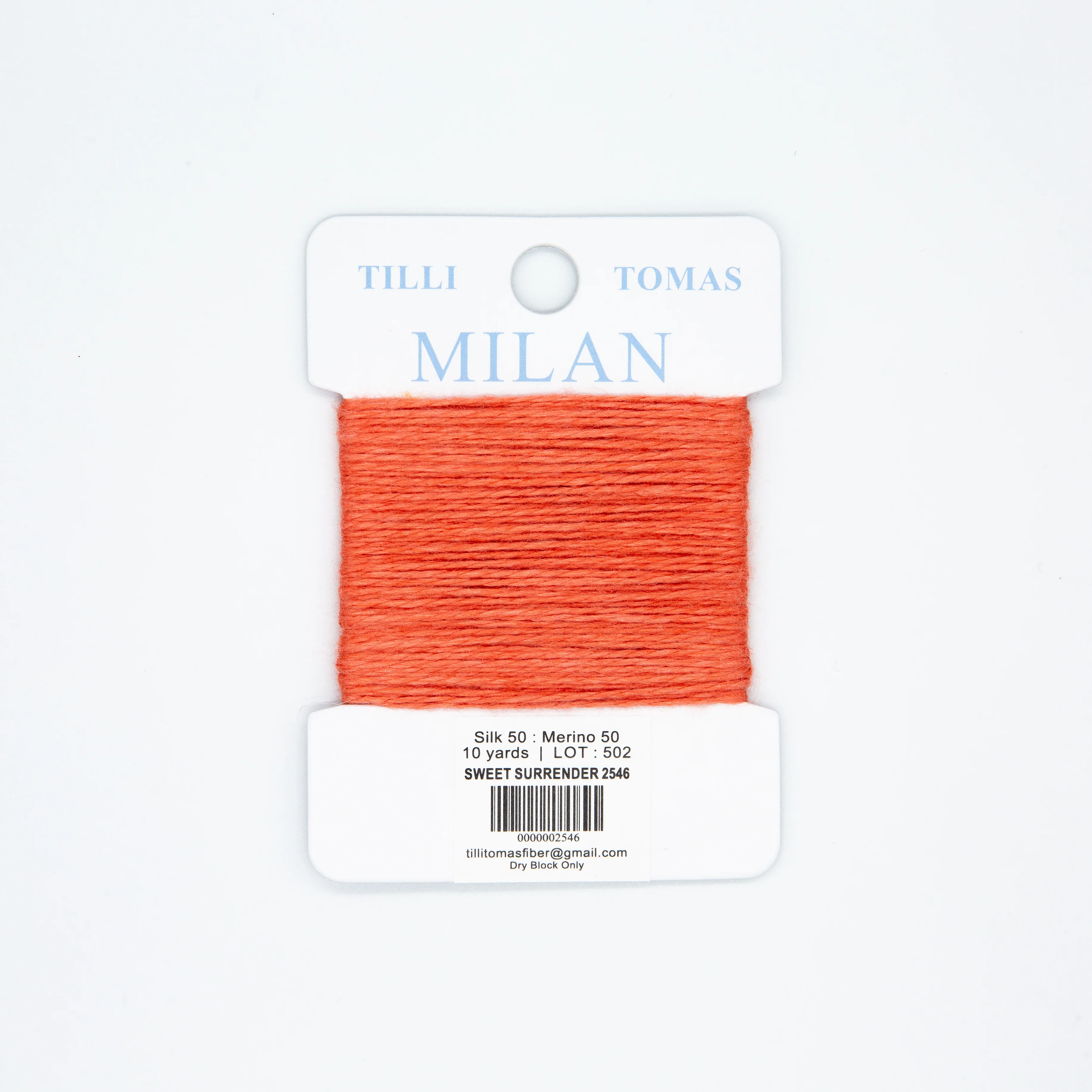 This is a Milan color card from Planet Earth in Sweet Surrender. A soft silk-wool blend that is perfect for pillows. 1 ply on 13 mesh. Colors match Essentials.