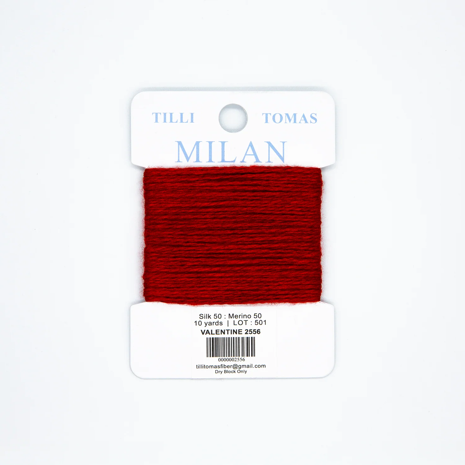 This is a Milan color card from Planet Earth in Valentine. A soft silk-wool blend that is perfect for pillows. 1 ply on 13 mesh. Colors match Essentials.