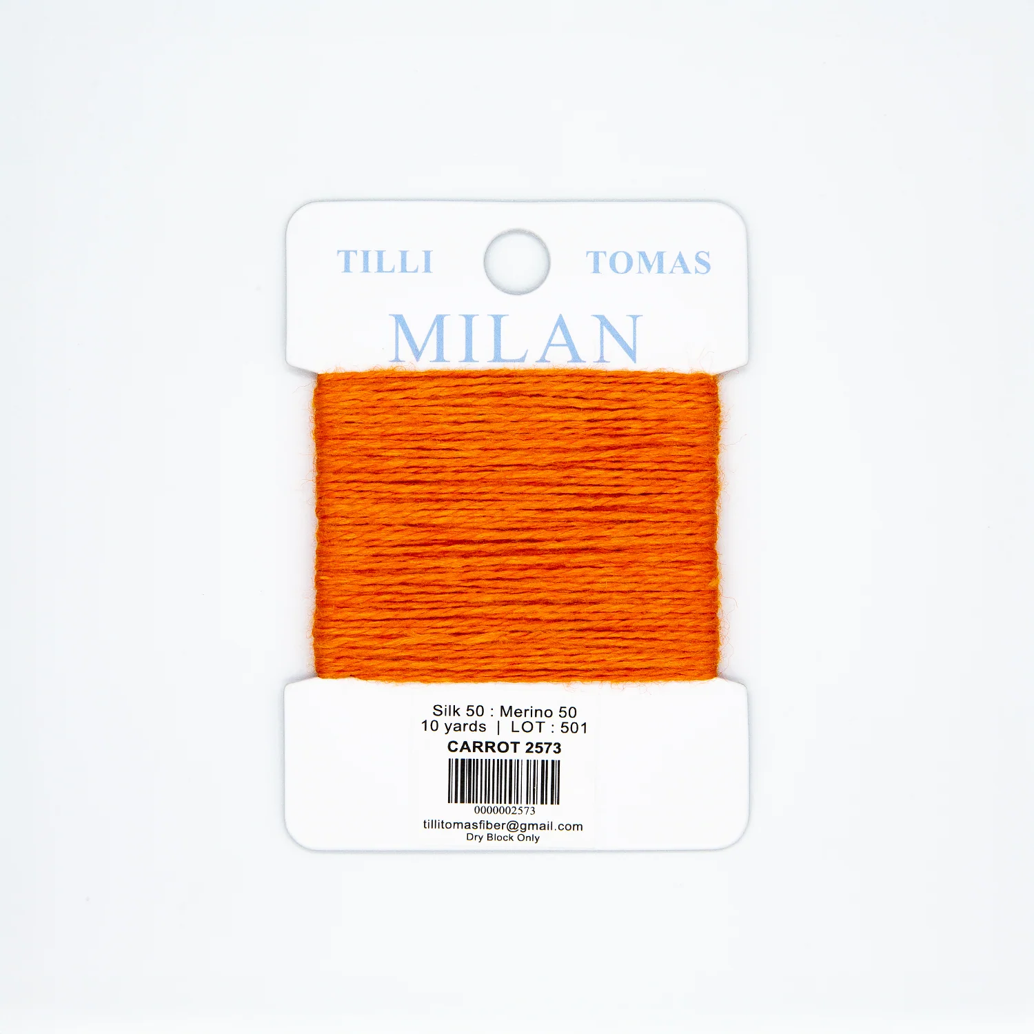 This is a Milan color card from Planet Earth in Carrot. A soft silk-wool blend that is perfect for pillows. 1 ply on 13 mesh. Colors match Essentials.