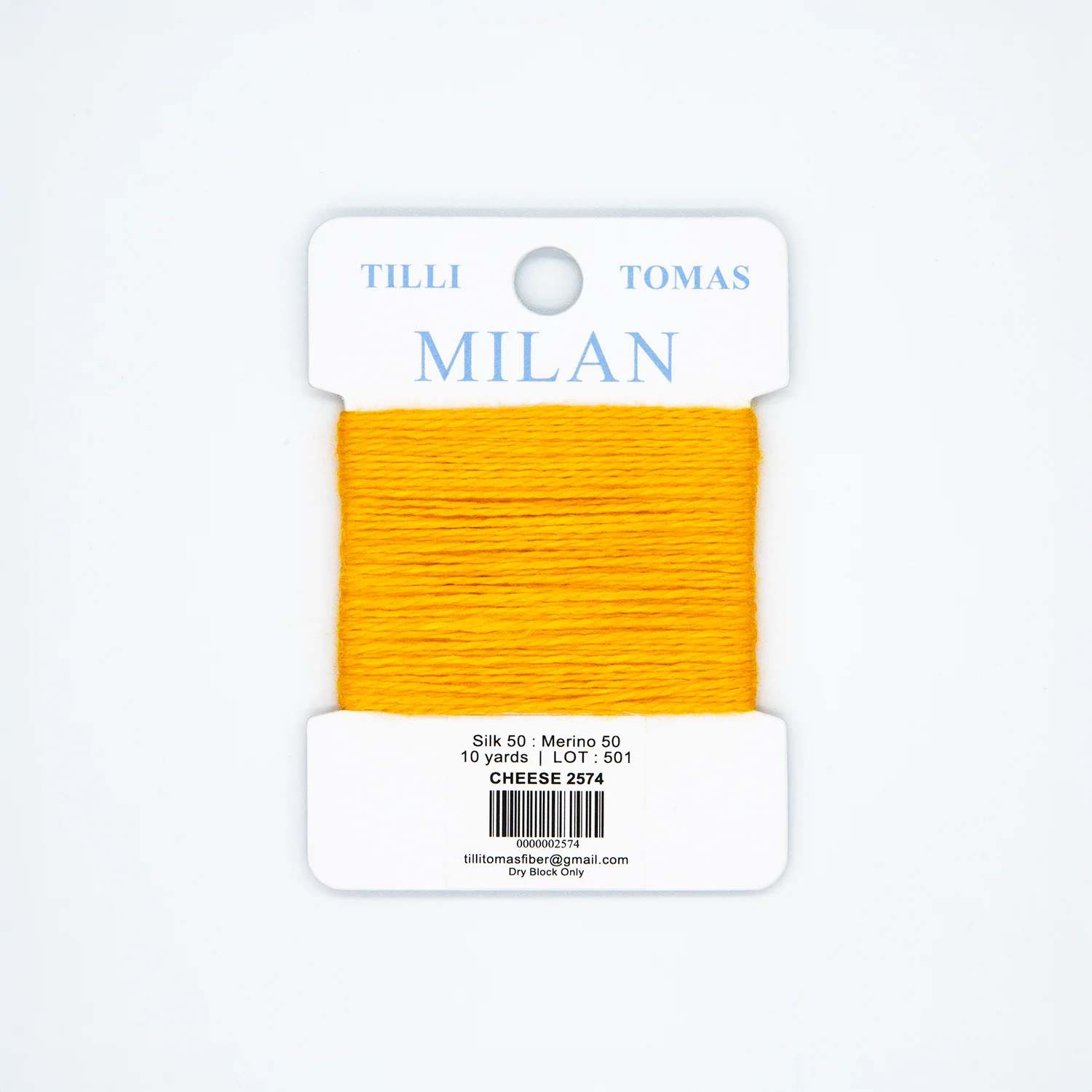 This is a Milan color card from Planet Earth in Cheese. A soft silk-wool blend that is perfect for pillows. 1 ply on 13 mesh. Colors match Essentials.