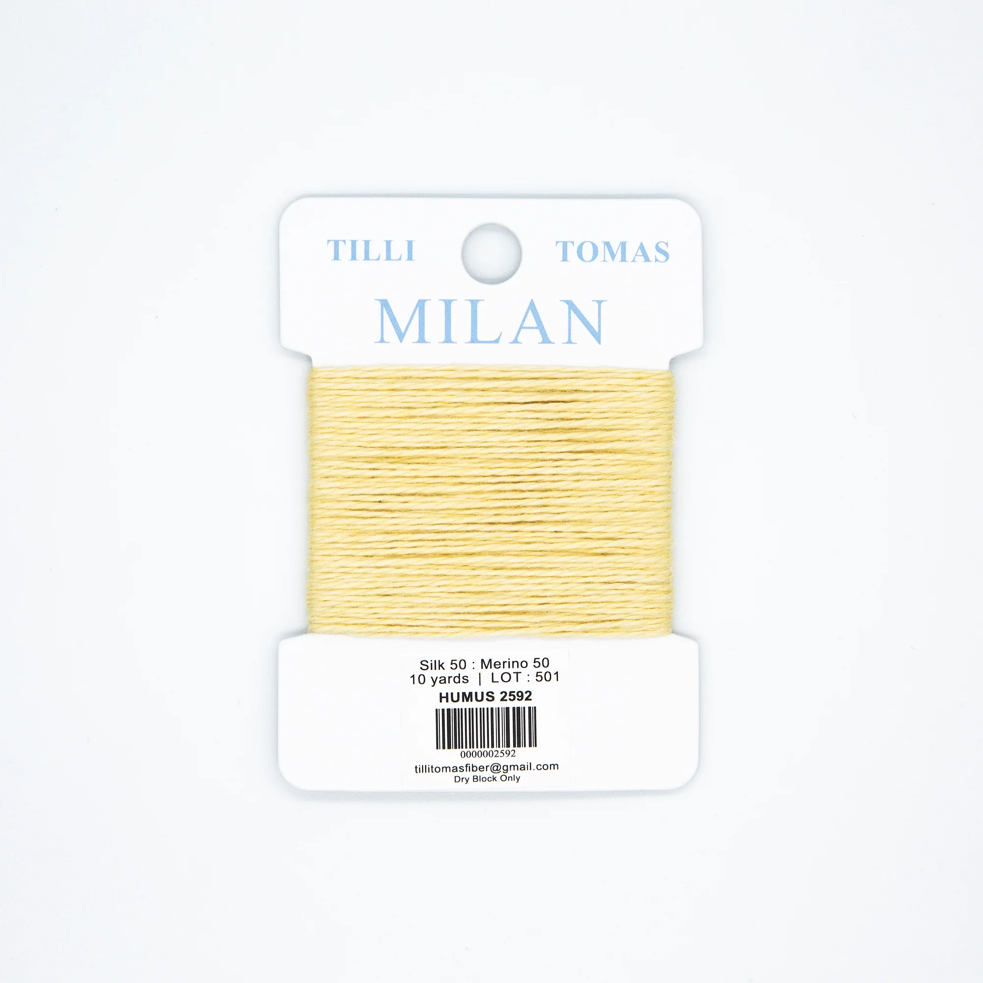 This is a Milan color card from Planet Earth in Hummus. A soft silk-wool blend that is perfect for pillows. 1 ply on 13 mesh. Colors match Essentials.