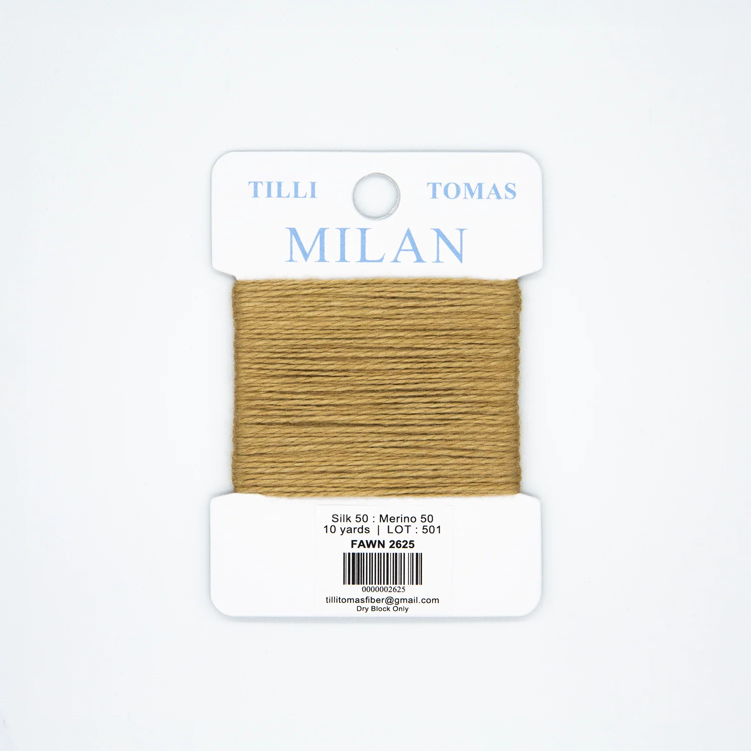 This is a Milan color card from Planet Earth in Fawn. A soft silk-wool blend that is perfect for pillows. 1 ply on 13 mesh. Colors match Essentials.