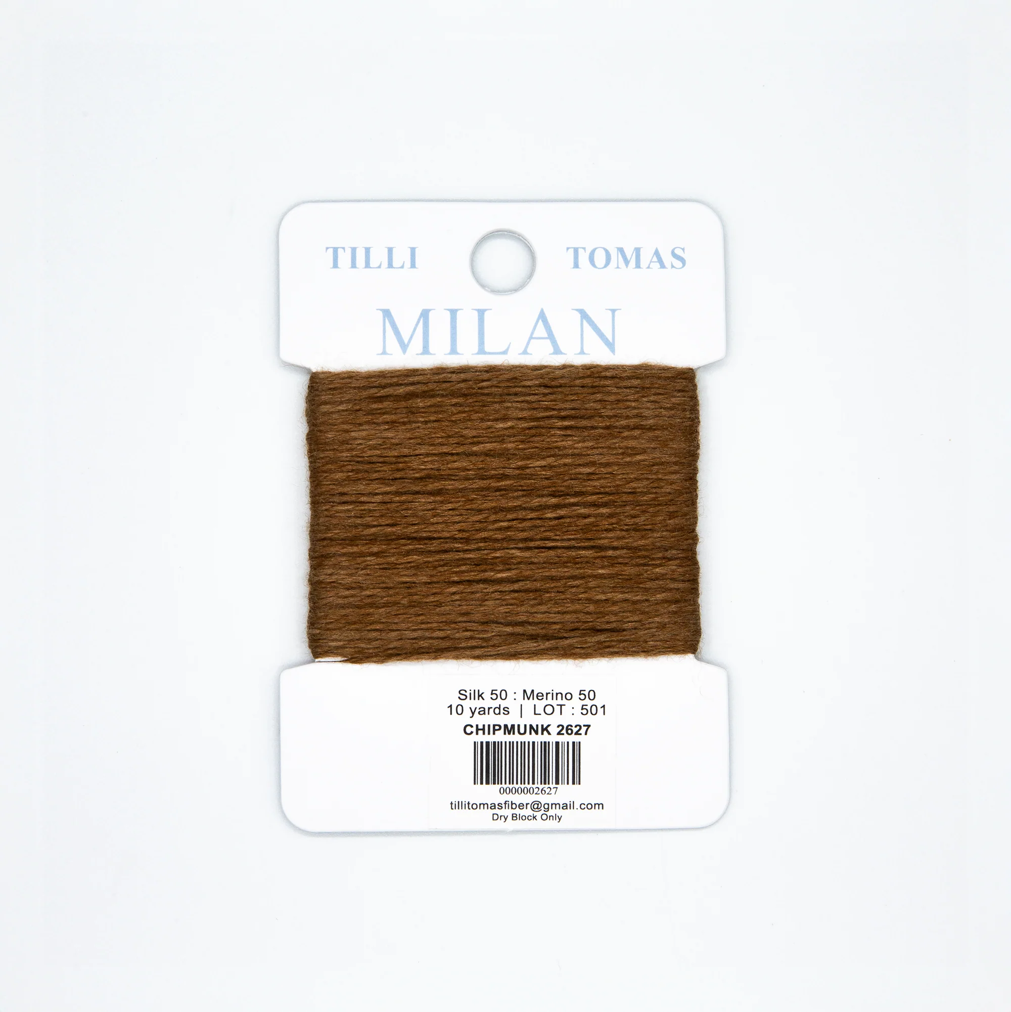 This is a Milan color card from Planet Earth in Chipmunk. A soft silk-wool blend that is perfect for pillows. 1 ply on 13 mesh. Colors match Essentials.
