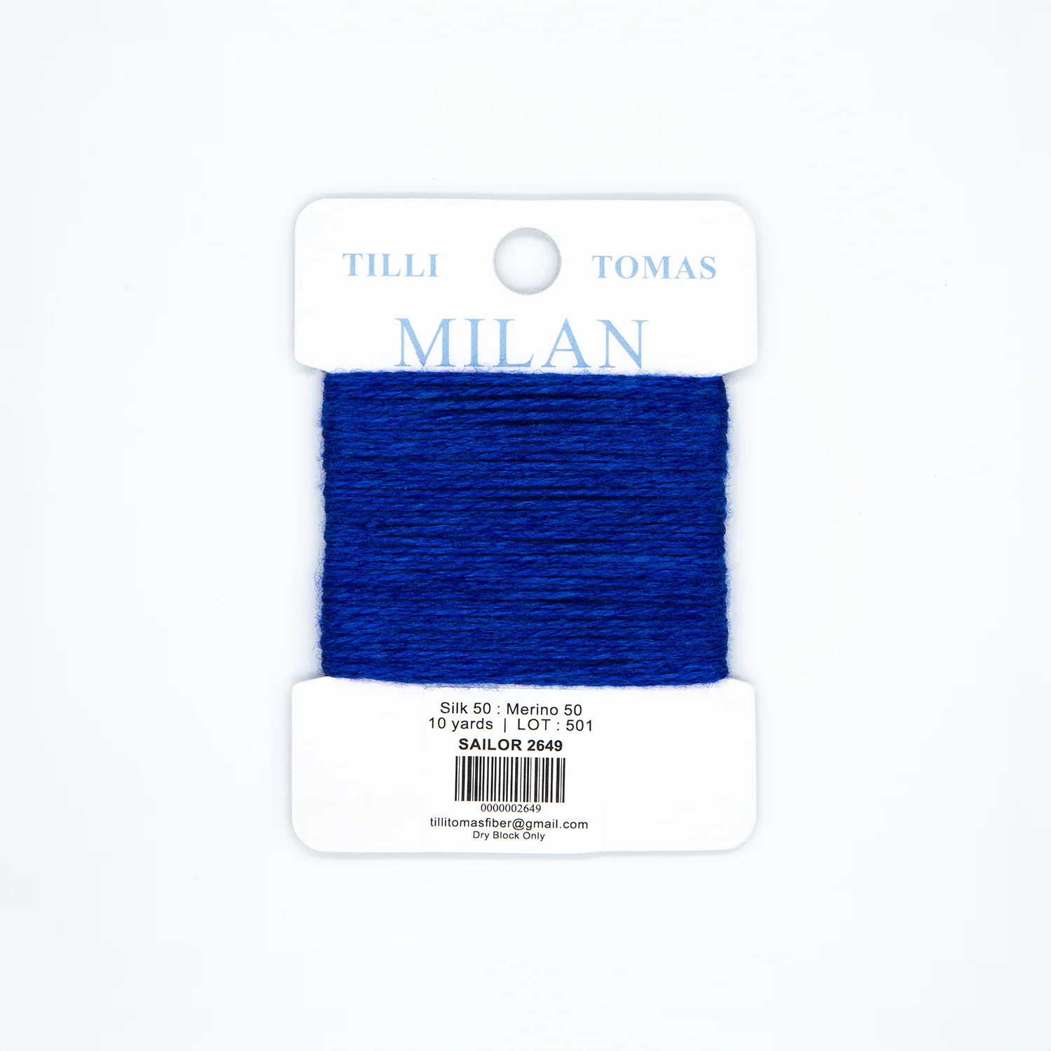 This is a Milan color card from Planet Earth in Sailor. A soft silk-wool blend that is perfect for pillows. 1 ply on 13 mesh. Colors match Essentials.