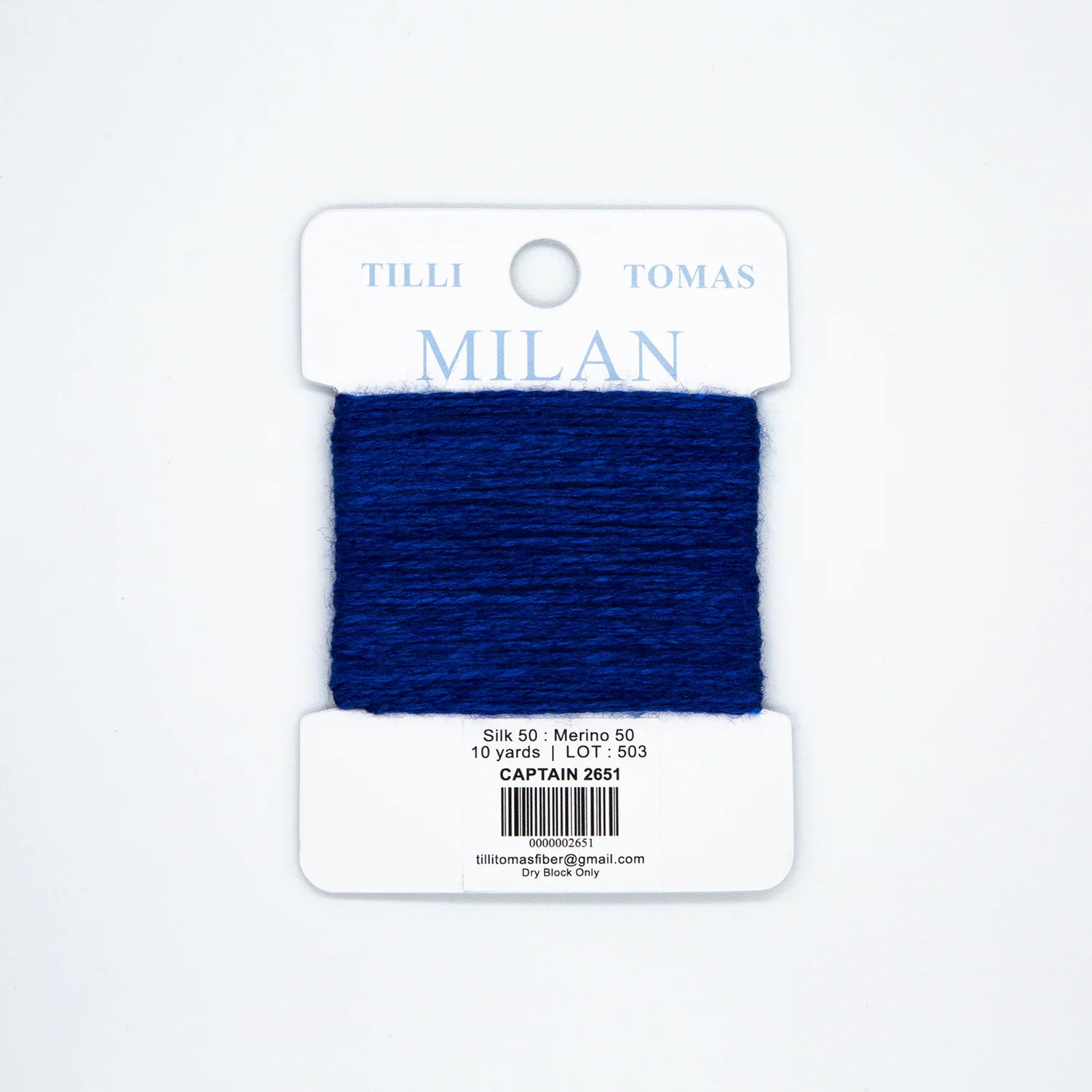 This is a Milan color card from Planet Earth in Captain. A soft silk-wool blend that is perfect for pillows. 1 ply on 13 mesh. Colors match Essentials.