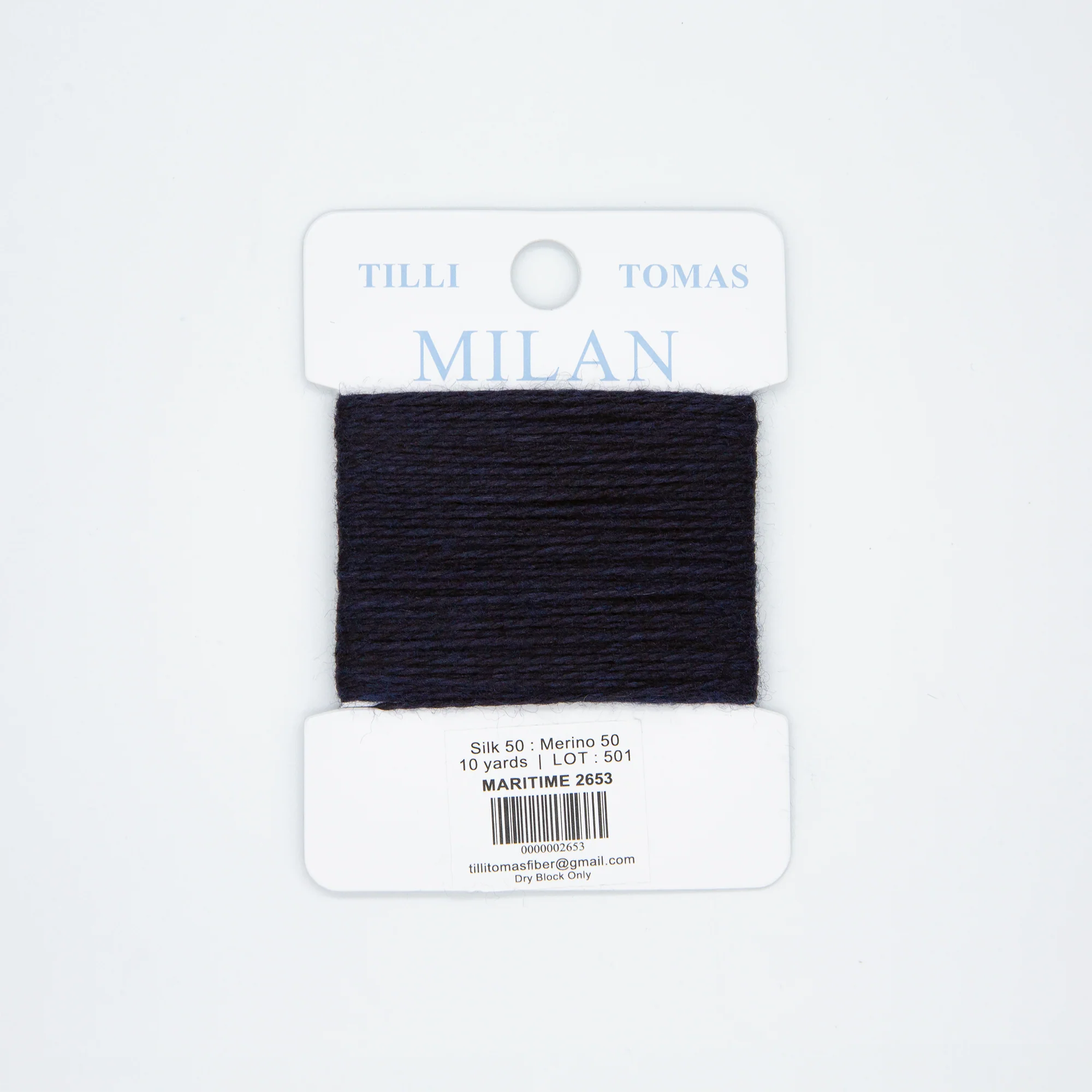 This is a Milan color card from Planet Earth in Maritime. A soft silk-wool blend that is perfect for pillows. 1 ply on 13 mesh. Colors match Essentials.