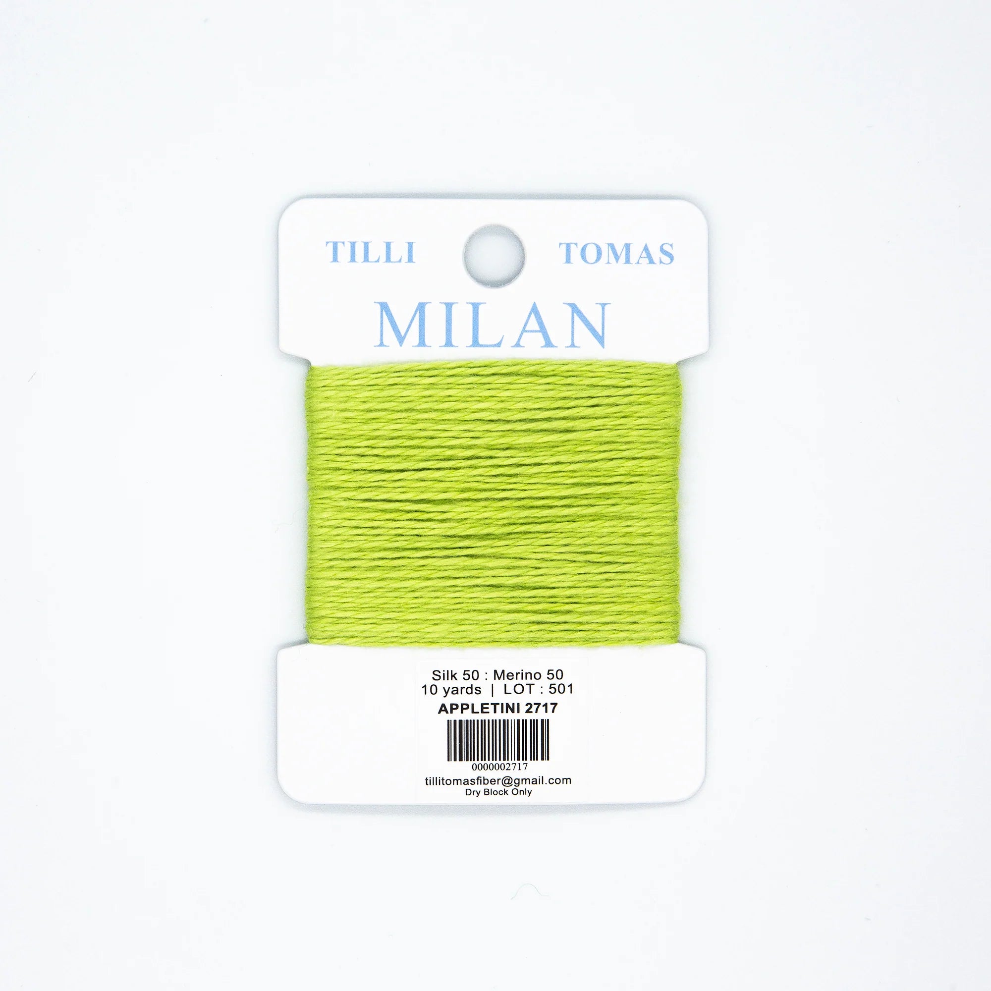 This is a Milan color card from Planet Earth in Appletini. A soft silk-wool blend that is perfect for pillows. 1 ply on 13 mesh. Colors match Essentials.