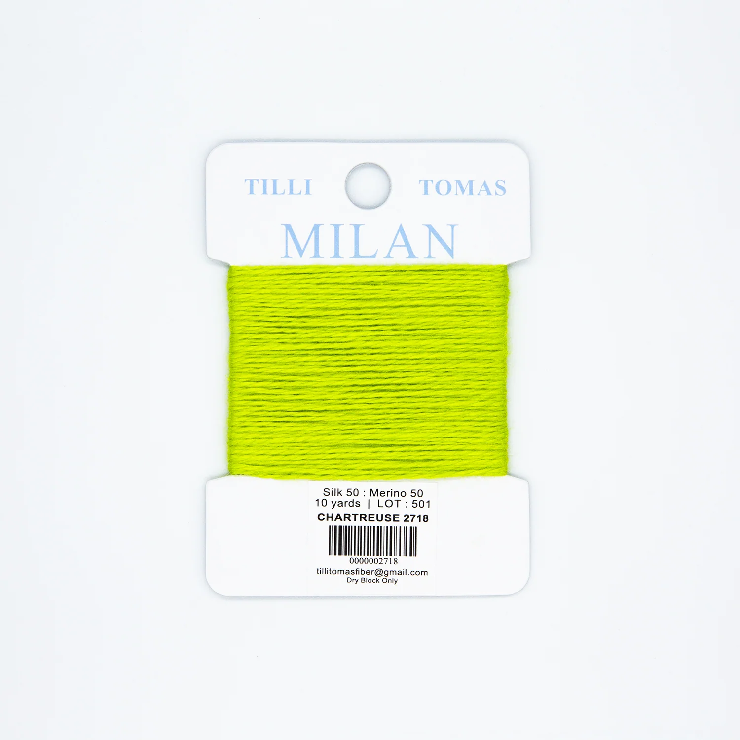 This is a Milan color card from Planet Earth in Chartreuse. A soft silk-wool blend that is perfect for pillows. 1 ply on 13 mesh. Colors match Essentials.