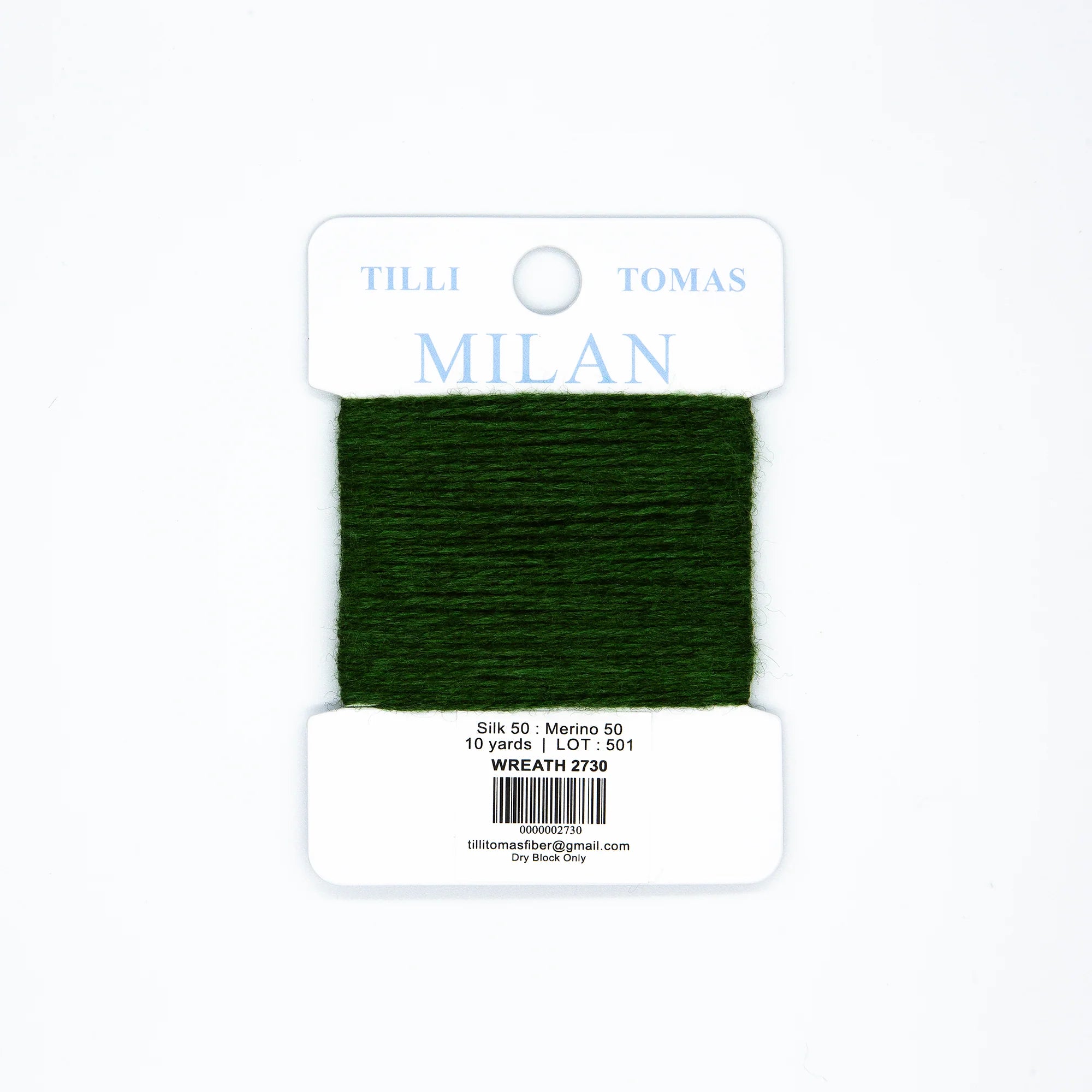 This is a Milan color card from Planet Earth in Wreath. A soft silk-wool blend that is perfect for pillows. 1 ply on 13 mesh. Colors match Essentials.
