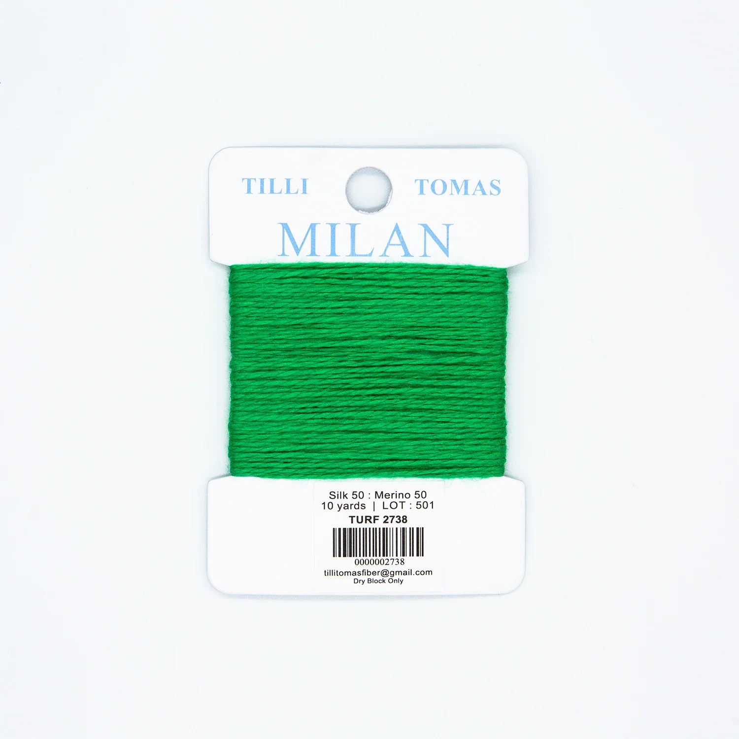 This is a Milan color card from Planet Earth in Turf. A soft silk-wool blend that is perfect for pillows. 1 ply on 13 mesh. Colors match Essentials.