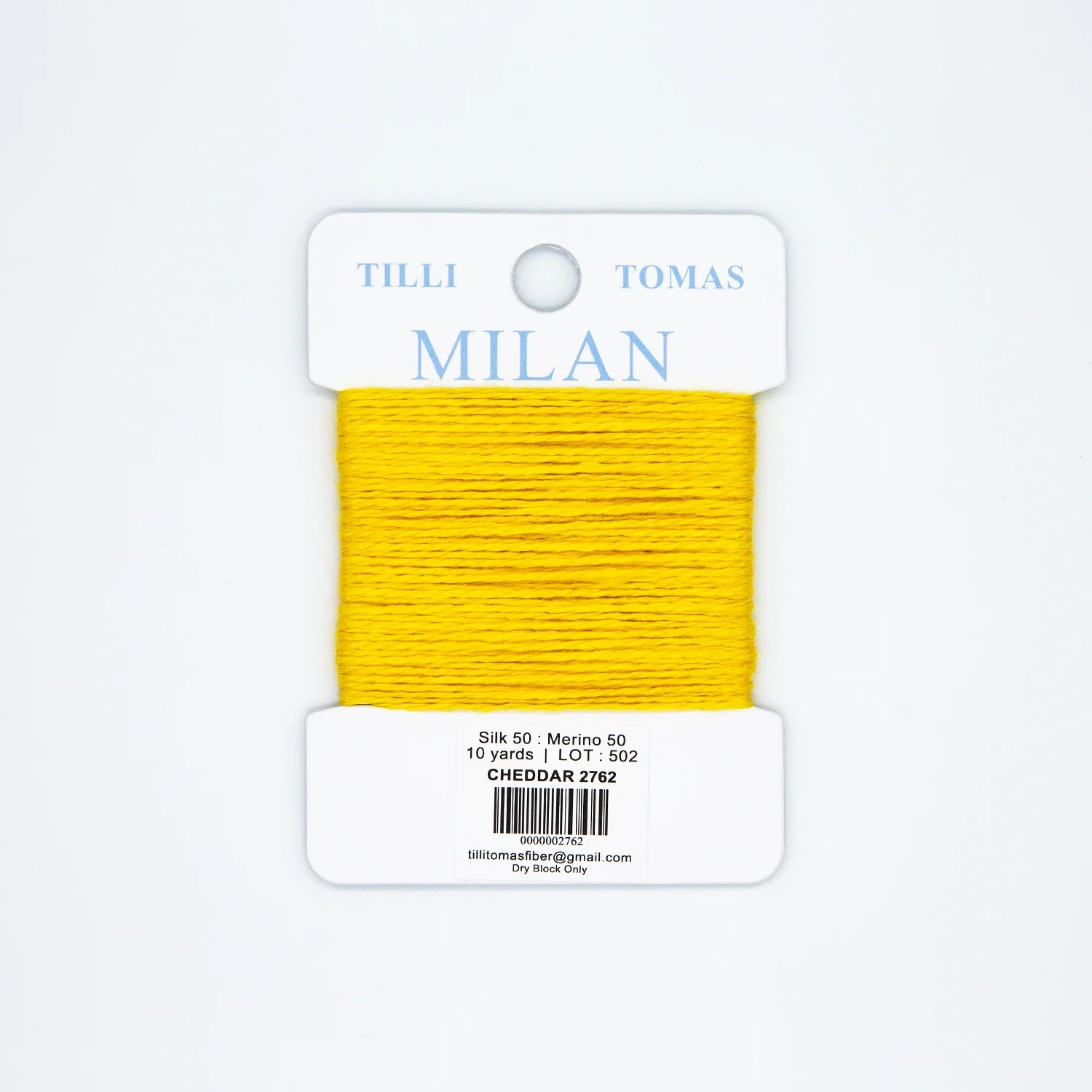 This is a Milan color card from Planet Earth in Cheddar. A soft silk-wool blend that is perfect for pillows. 1 ply on 13 mesh. Colors match Essentials.