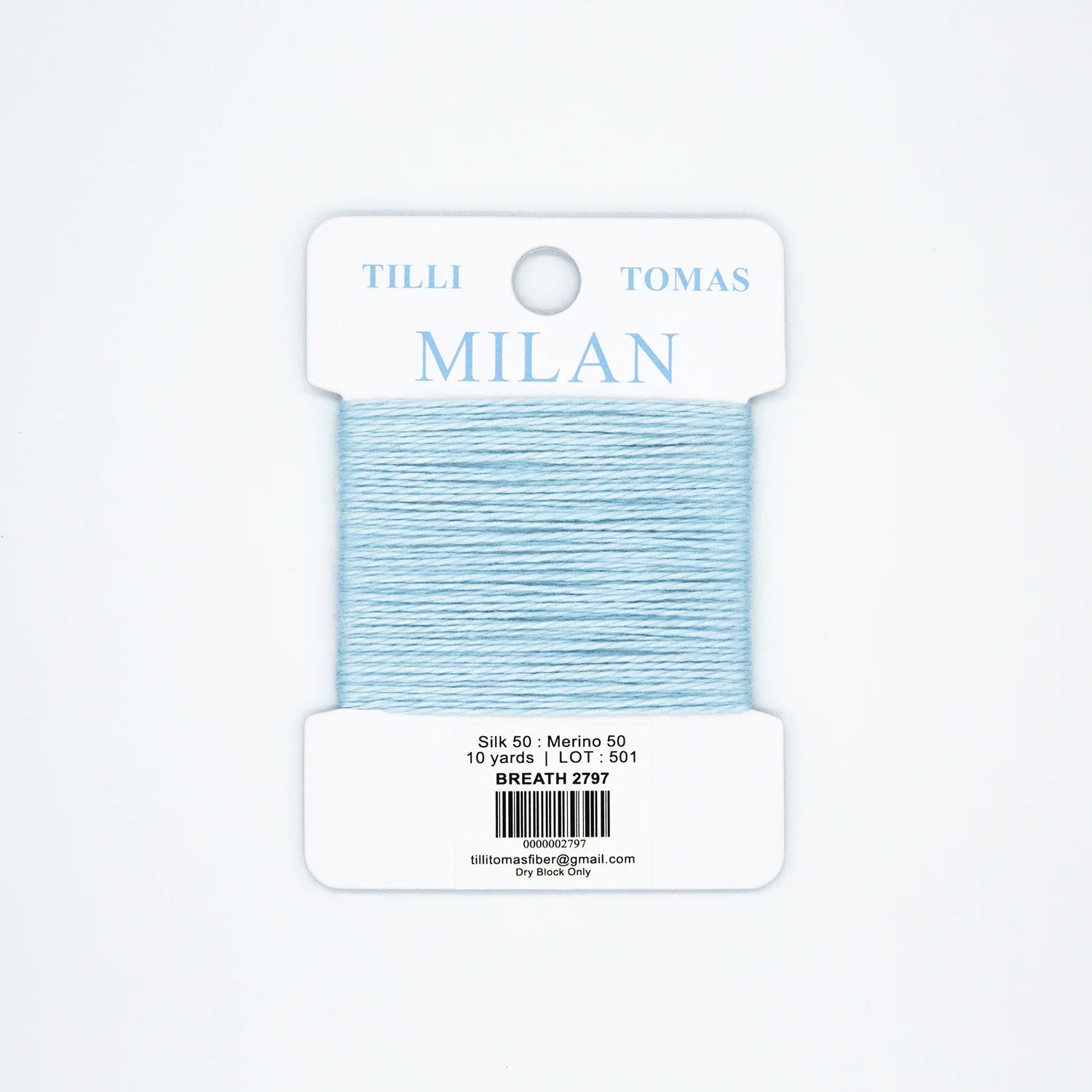 This is a Milan color card from Planet Earth in Breath. A soft silk-wool blend that is perfect for pillows. 1 ply on 13 mesh. Colors match Essentials.