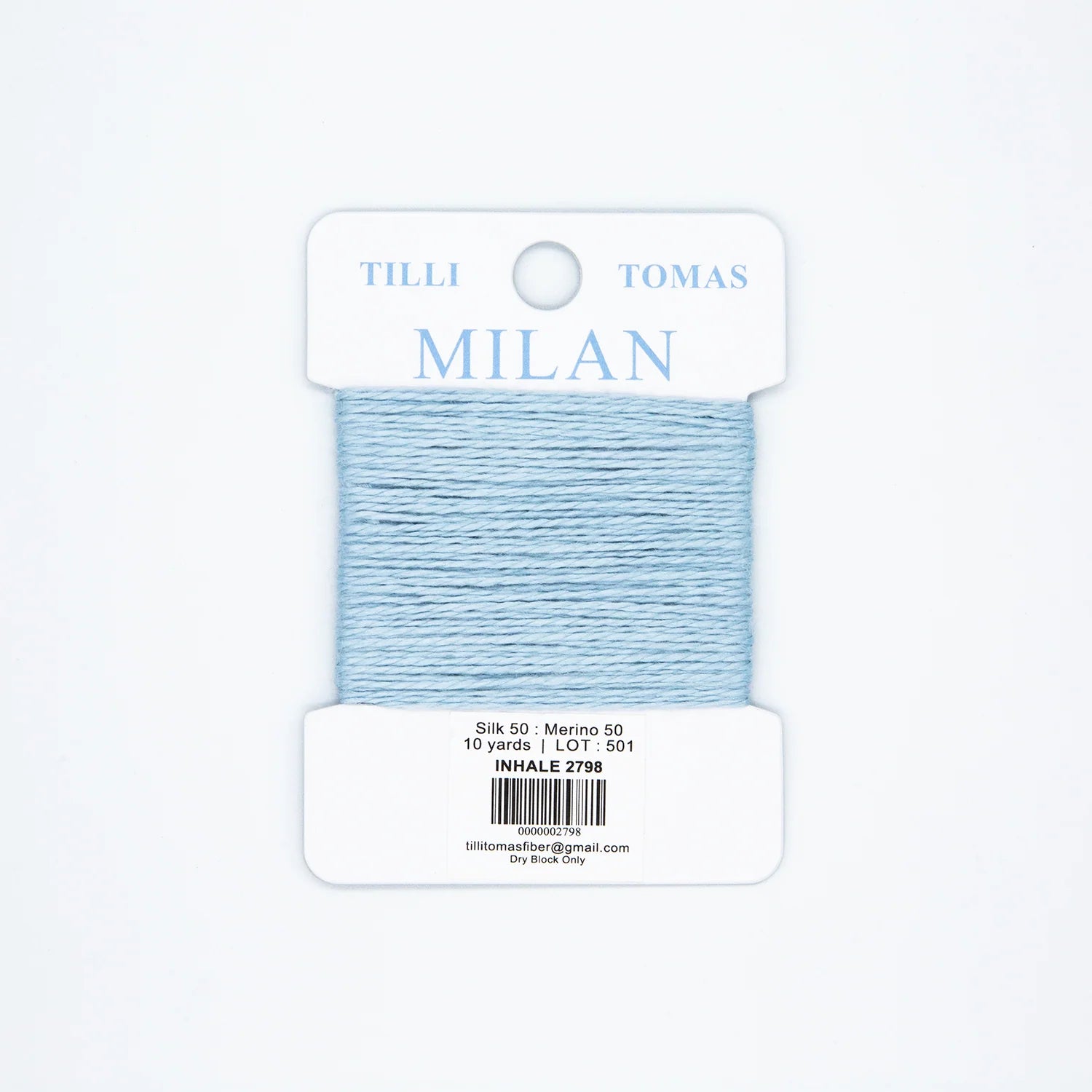 This is a Milan color card from Planet Earth in Inhale. A soft silk-wool blend that is perfect for pillows. 1 ply on 13 mesh. Colors match Essentials.