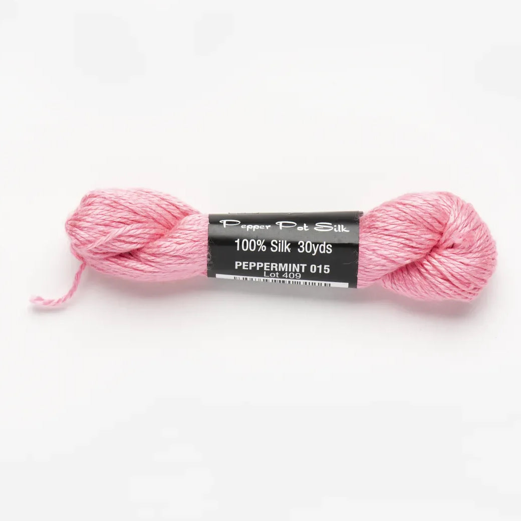 This is Pepper Pot Silk from Planet Earth in color 015 Peppermint. Rich silks in a wide variety of colors.1 ply on 18 mesh.