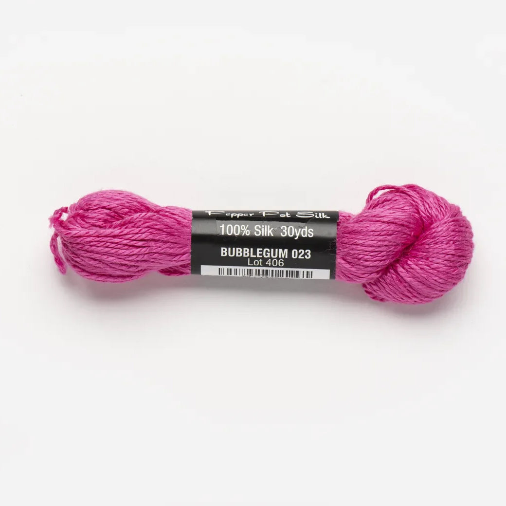 This is Pepper Pot Silk from Planet Earth in color 023 Bubblegum. Rich silks in a wide variety of colors.1 ply on 18 mesh.