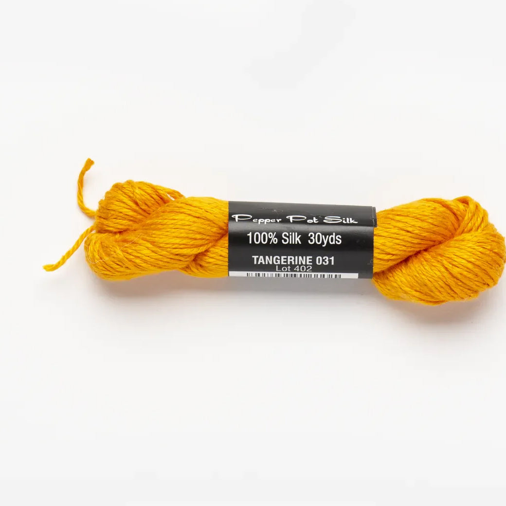 This is Pepper Pot Silk from Planet Earth in color 031 Tangerine. Rich silks in a wide variety of colors.1 ply on 18 mesh.