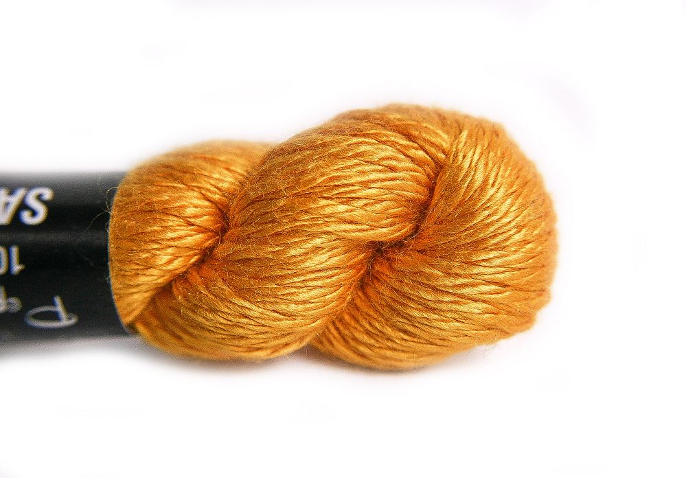 This is Pepper Pot Silk from Planet Earth in color 041 Saffron. Rich silks in a wide variety of colors.1 ply on 18 mesh.