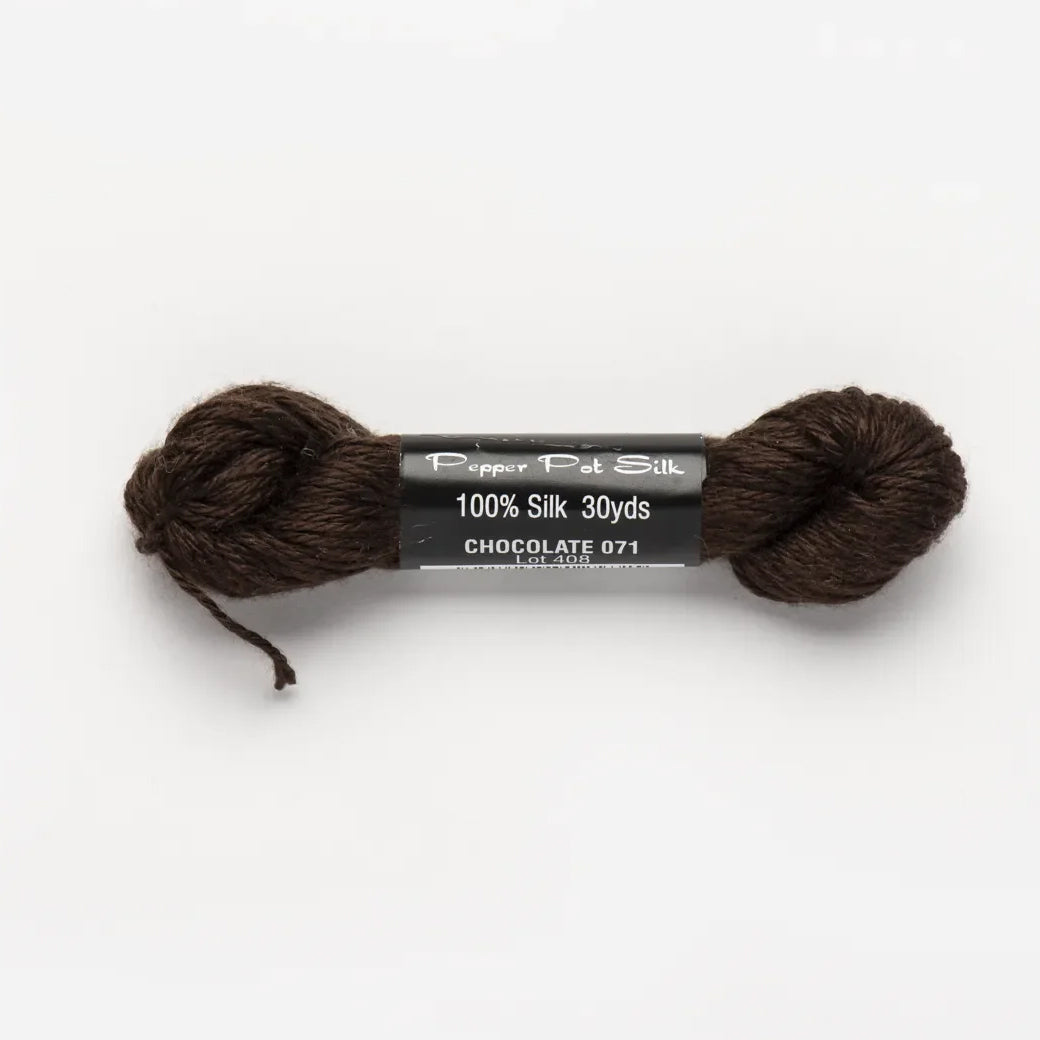 This is Pepper Pot Silk from Planet Earth in color 071 Chocolate. Rich silks in a wide variety of colors.1 ply on 18 mesh.
