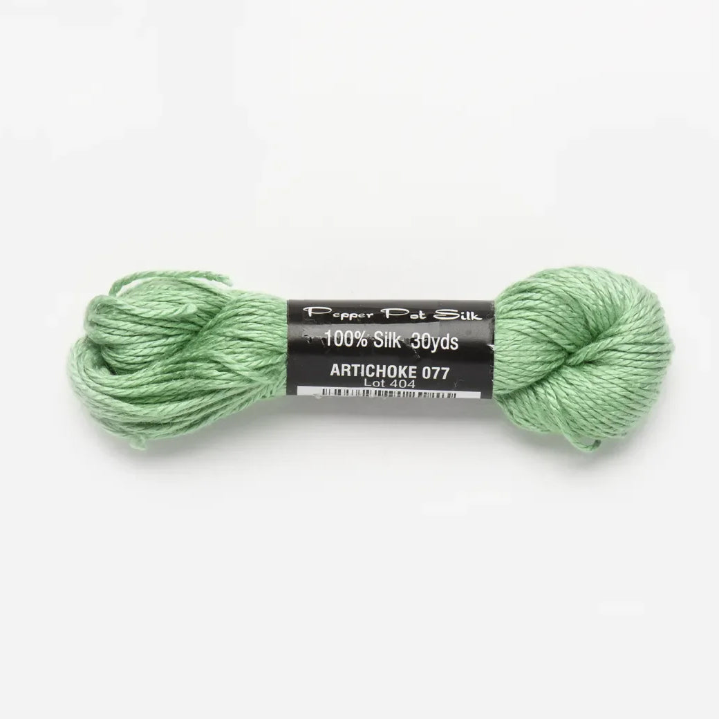 This is Pepper Pot Silk from Planet Earth in color 077 Artichoke. Rich silks in a wide variety of colors.1 ply on 18 mesh.