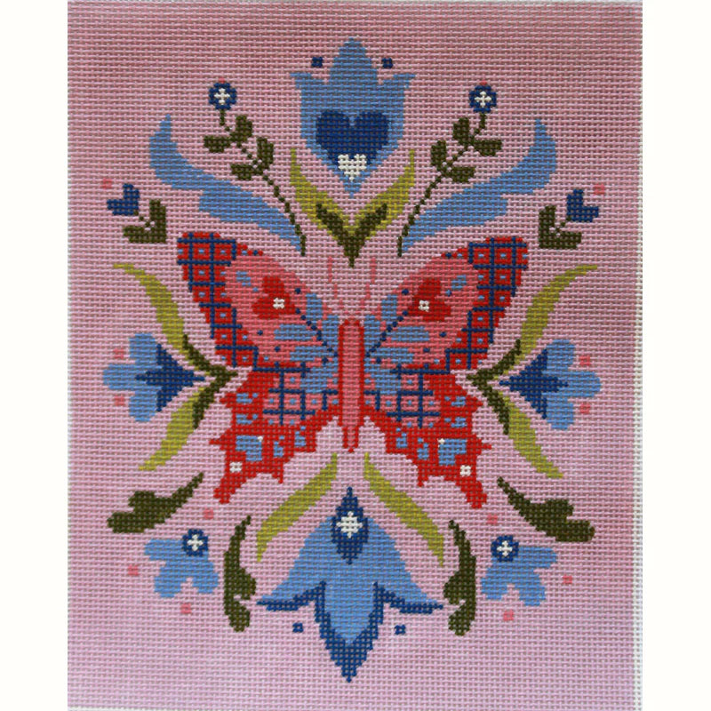 This hand painted needlepoint canvas by Abigail Cecile for PLD Designs features a pretty design with a red and pink butterfly and flowers.