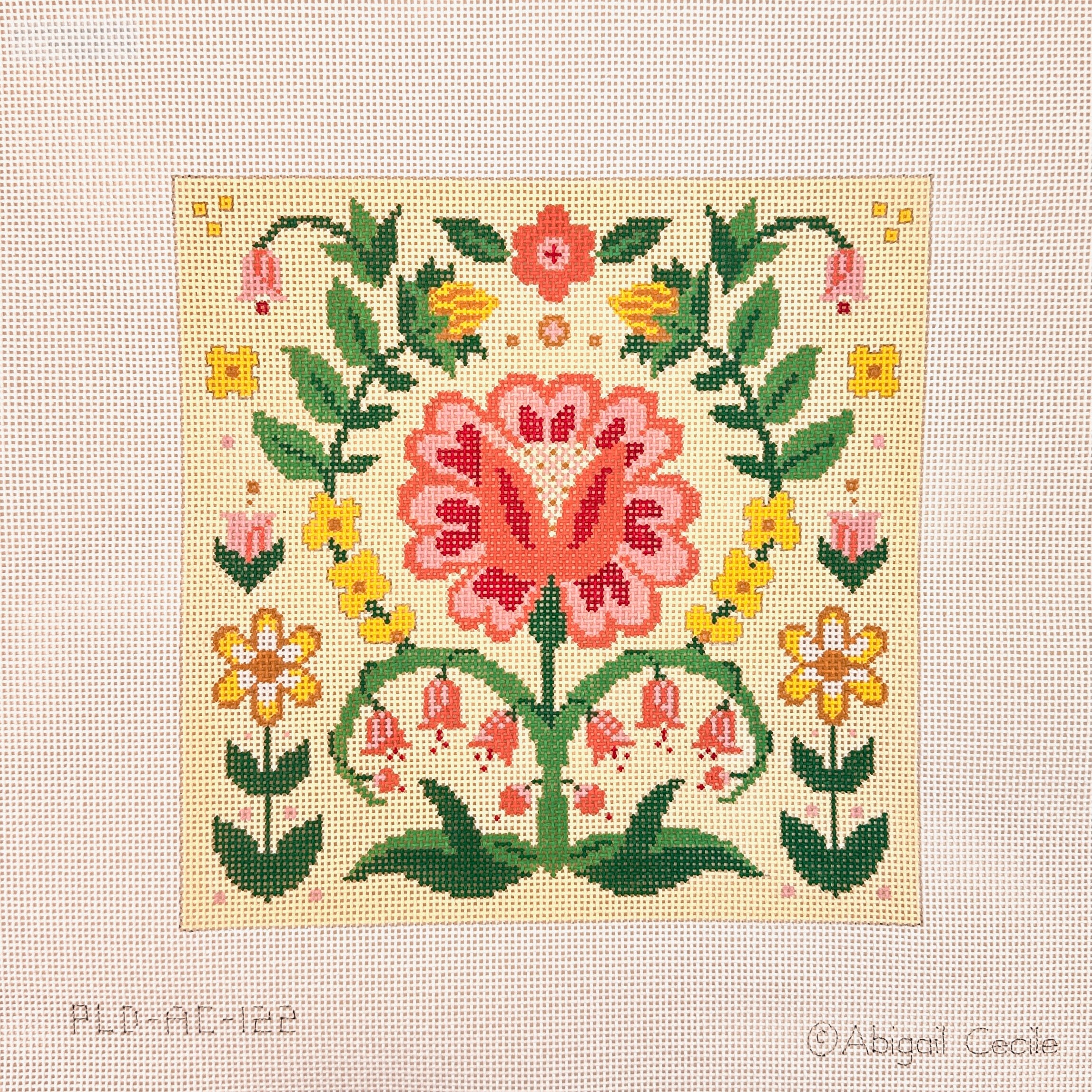 This is a needlepoint canvas by Abigail Cecile from PLD Designs. It features a beautiful floral design set to a cream background.