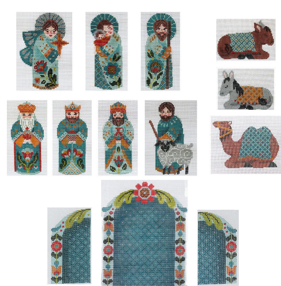 This is a full set of hand painted nativity needlepoint canvases by Abigail Cecile for PLD Designs. Included are 13 canvases that include: Mary with baby Jesus, Joseph, each of the three kings, a shepherd, an angel, a donkey, a cow, a camel, and a 3 piece creche background. They all feature the designers signature Norwegian folk art and Jacobean floral inspired style in shades of teal blue with orange and red accents.