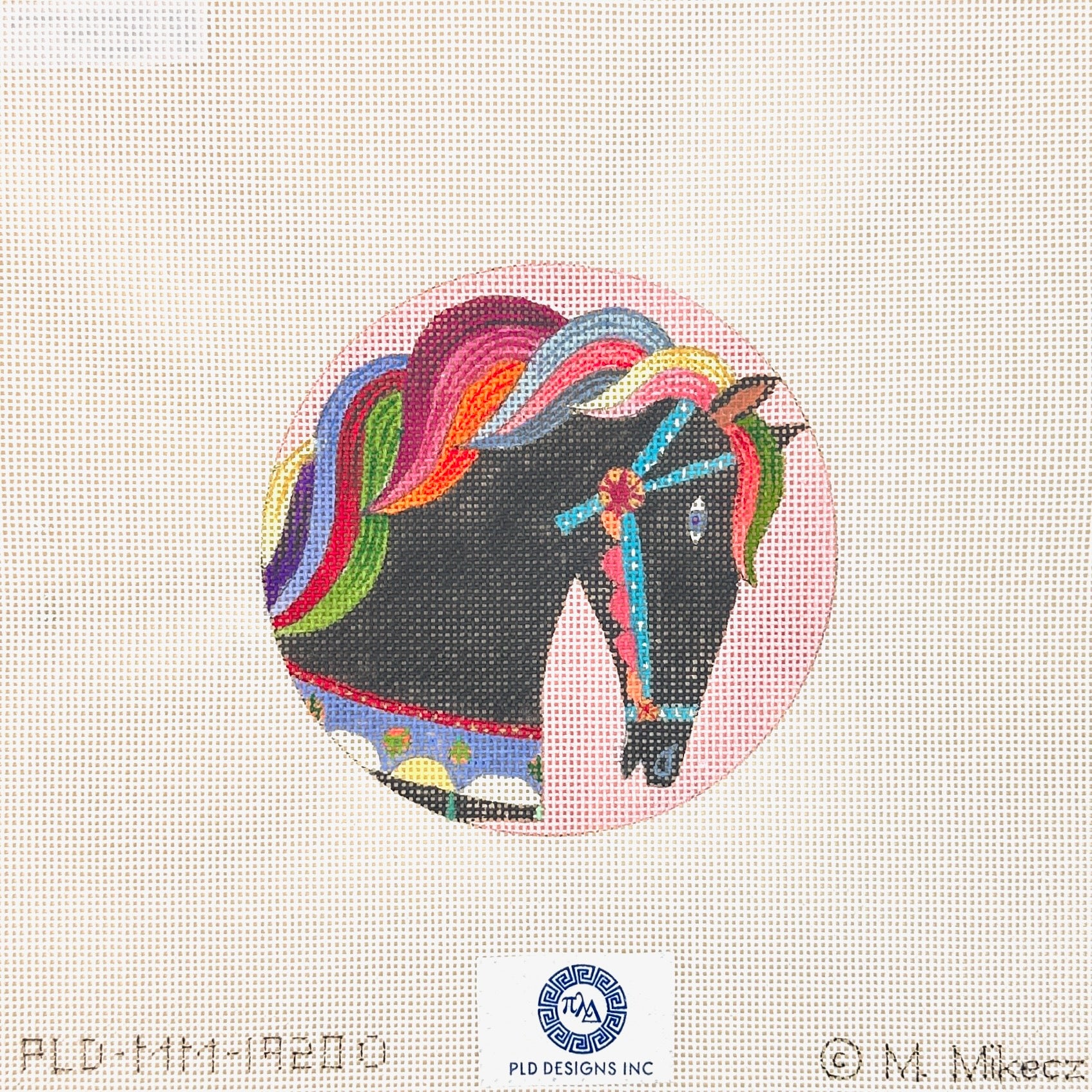 This is a needlepoint canvas by Melanie Mikecz from PLD Designs. It features a colorful carousel horse.
